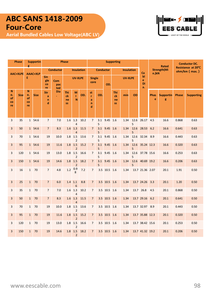 สายเคเบิลอลูมิเนียมแบบมัดรวมสำหรับระบบกระจายสัญญาณ NFC BT ABC และระบบไฟฟ้าชนบท ขนาด 3*70+54.6+16 มม.², 3*50+54.6+1*16 มม.² สำหรับเบลีซ