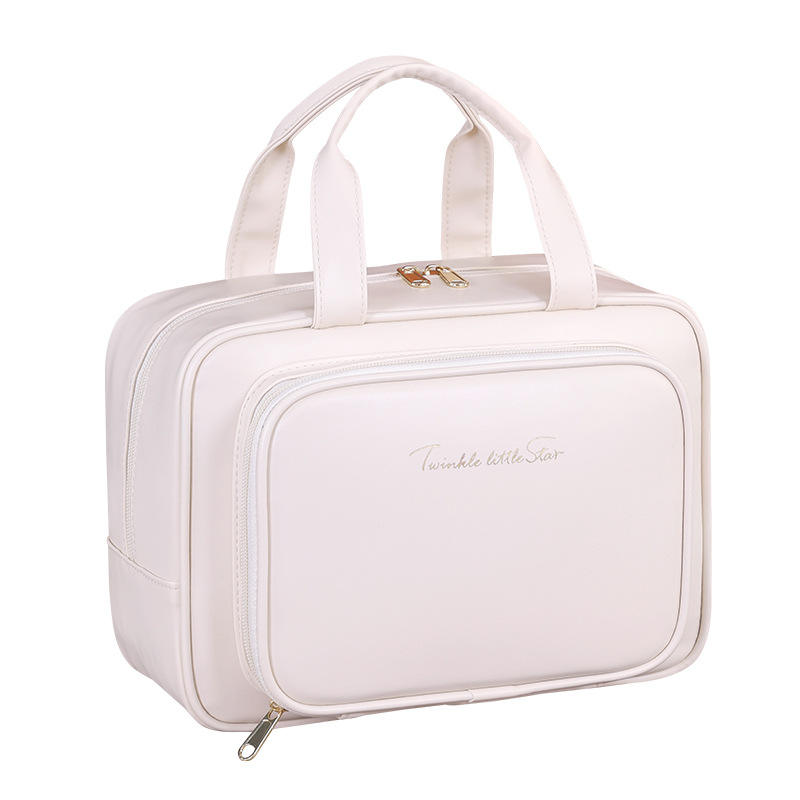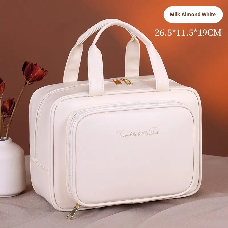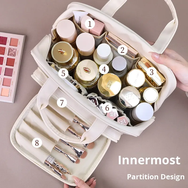 กระเป๋าจัดระเบียบเครื่องสำอางแบบพกพาสำหรับเดินทาง ความจุขนาดใหญ่ ทันสมัย ยั่งยืน พร้อมช่องใส่ของแบบแบ่งส่วน ตกแต่งด้วยหนัง