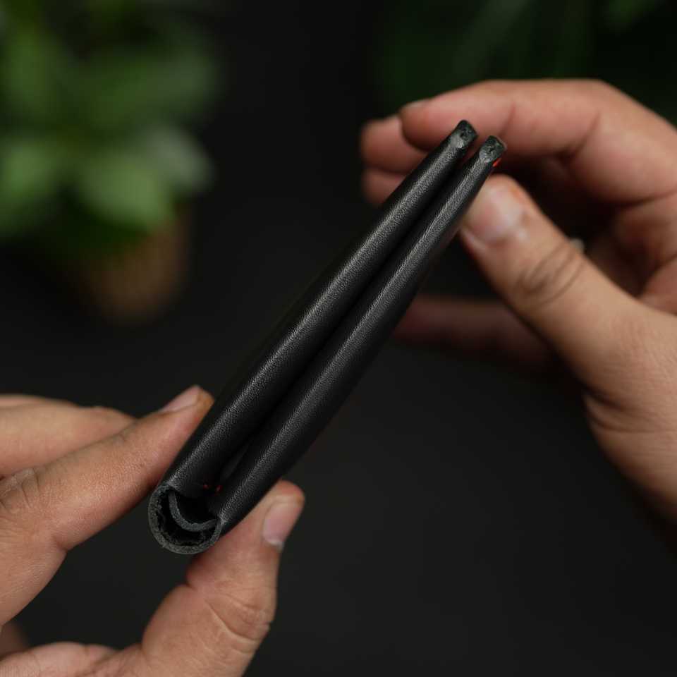 กระเป๋าสตางค์หนังแท้พับได้แบบคลาสสิค รุ่น NO.81 งานแฮนด์เมด รับประกัน 5 ปี สำหรับผู้ชาย หนังฟอกฝาดแบบวีแกน สีดำ แต่งสีแดง ป้องกันการโจรกรรม