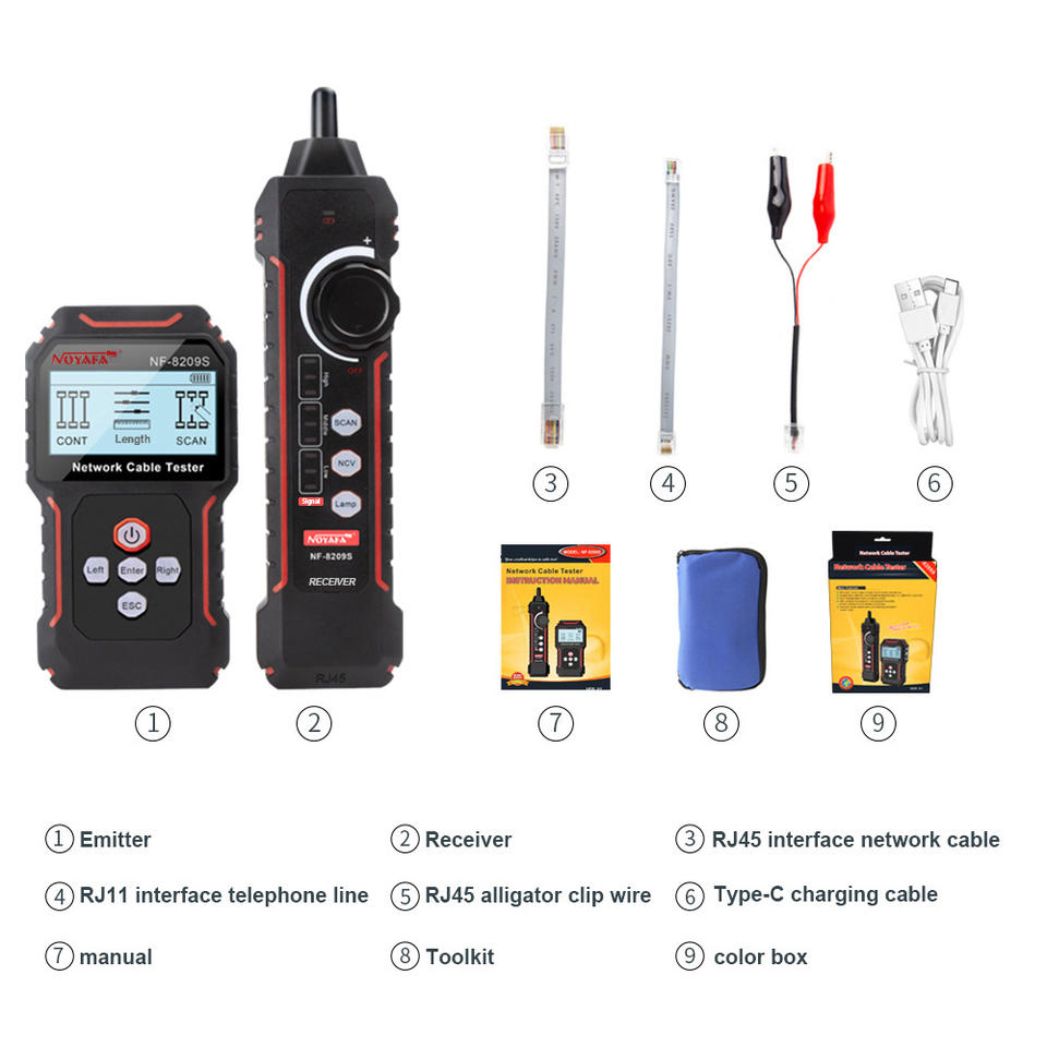 เครื่องทดสอบสายเคเบิลเครือข่าย NOYAFA NF-8209S Classic RJ45 CAT5 CAT6 LAN พร้อมฟังก์ชั่นติดตามสายและตรวจจับ PoE รองรับการสแกน NCV ระยะ 600 เมตร พร้อมพอร์ต Flash Crimp