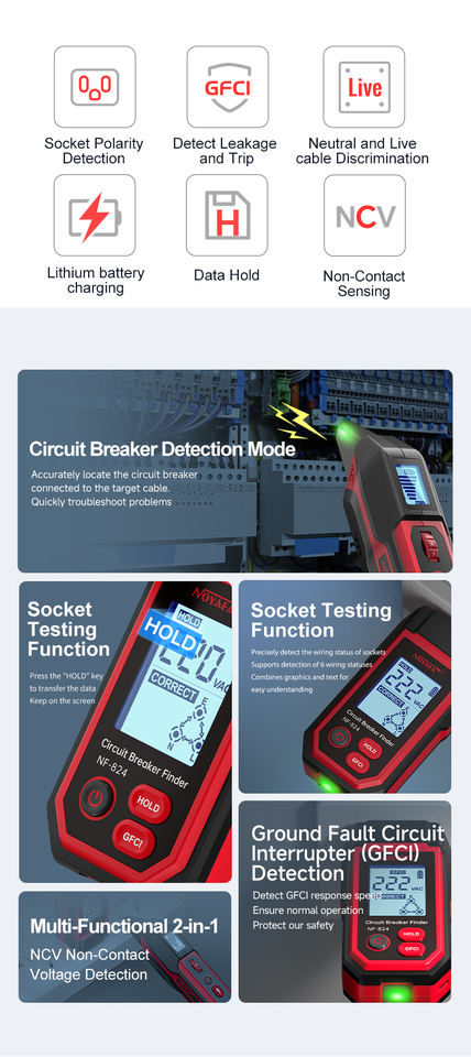 Noyafa ตัวค้นหาวงจรดิจิทัล NF-824, ตัวค้นหาวงจรพร้อมหน้าจอ LCD ความละเอียดสูงรองรับซ็อกเก็ต GFCI ทดสอบแรงดันไฟฟ้า