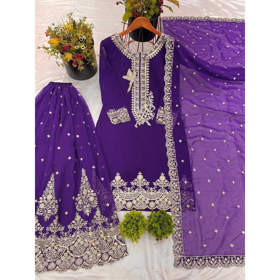 ชุดท็อป-ชาราราสีม่วงสวยงาม NSR พร้อมผ้าคลุมไหล่ ปักลายอย่างดีและประดับด้วยเลื่อม สำหรับชุดอินเดียและปากีสถาน