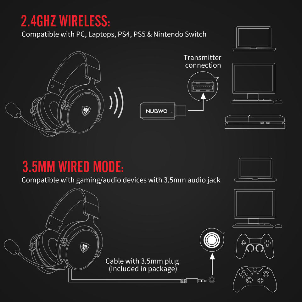Nubwo ชุดหูฟังไร้สายสำหรับเล่นเกม G07พร้อมไมค์แบบถอดออกได้2.4g + บลูทูธสองโหมดสำหรับพีซี PS5 xbox สวิตช์และมือถือ