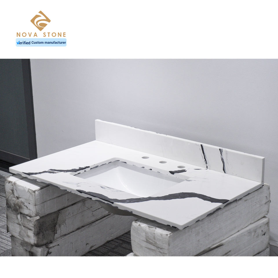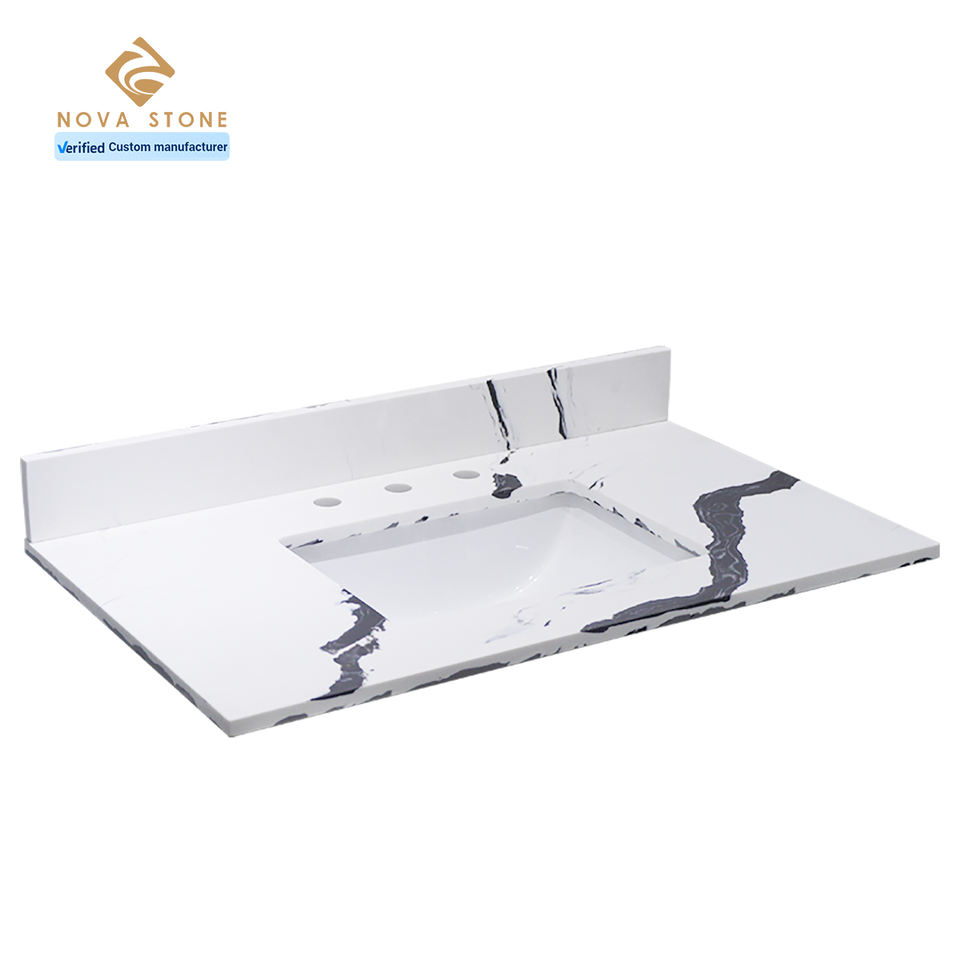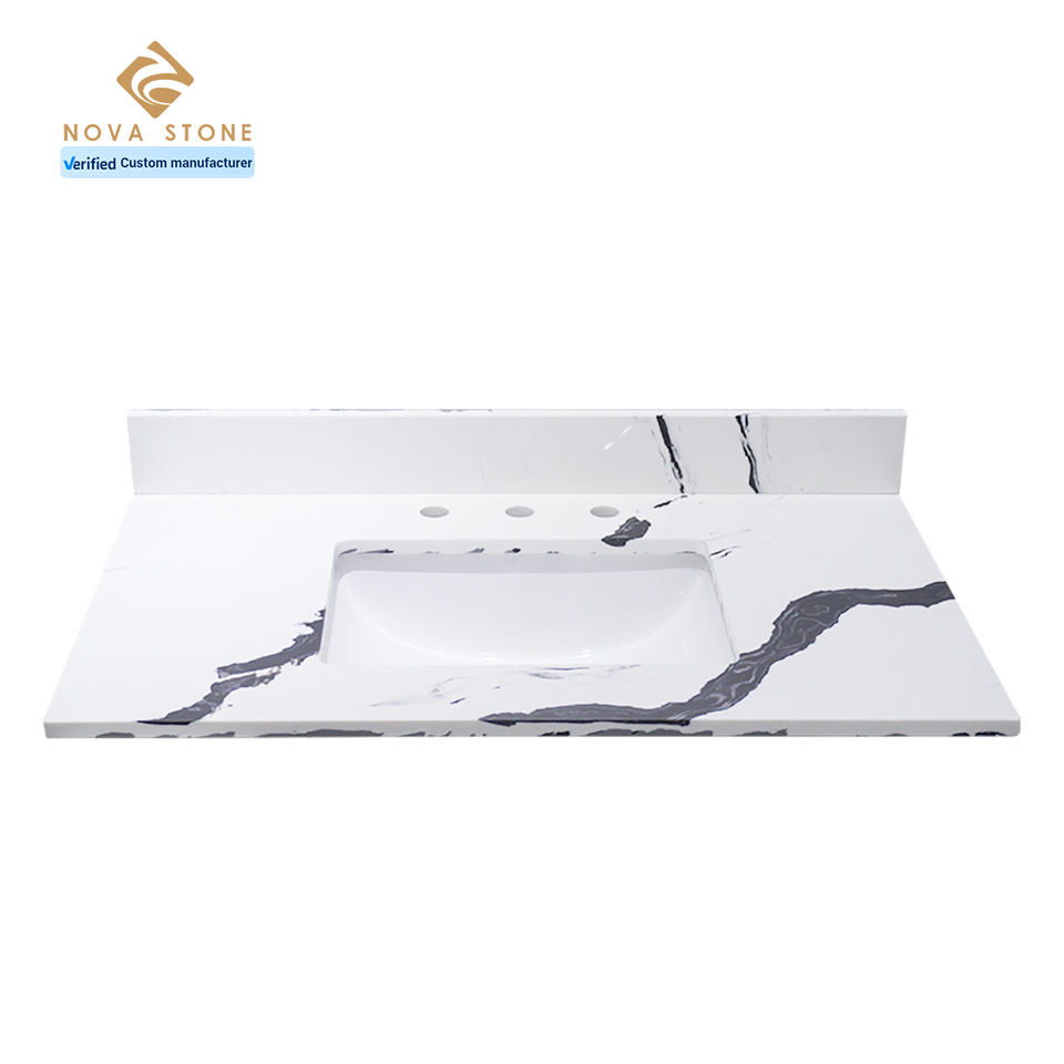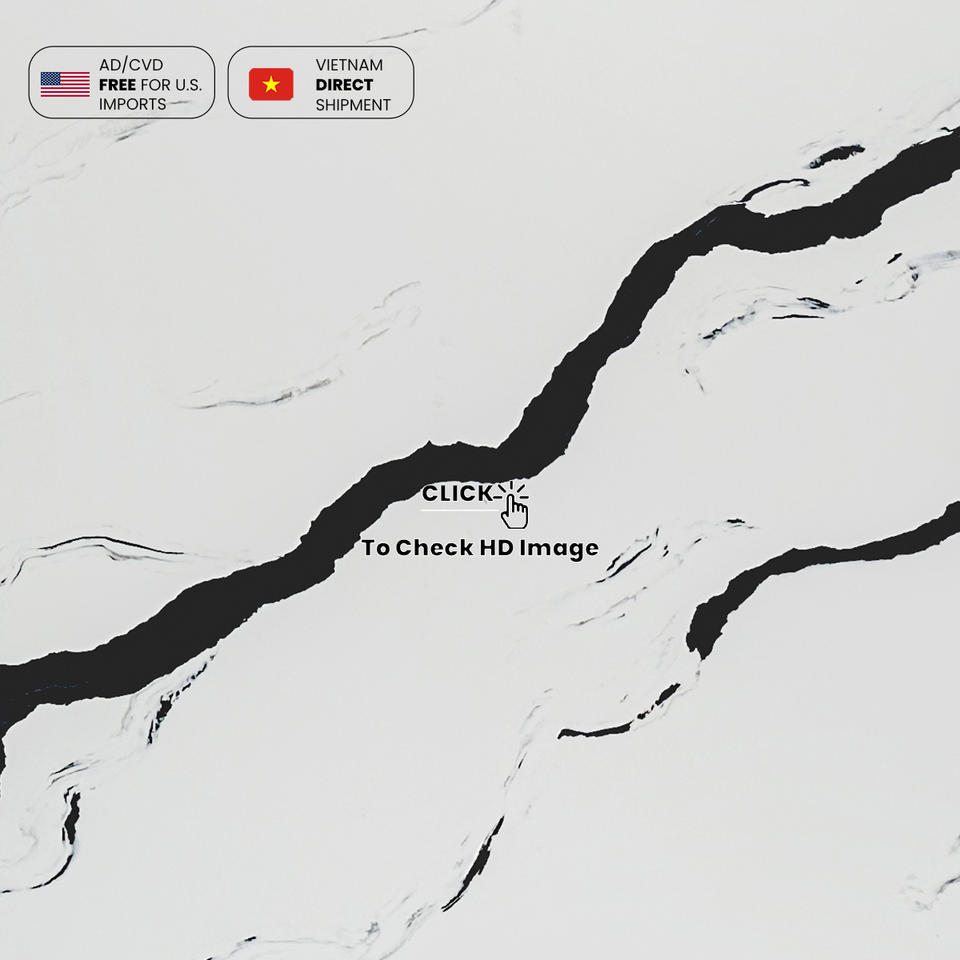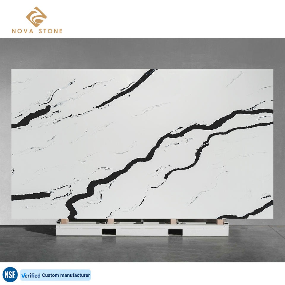 แผ่นควอตซ์ NV1001 Calacatta แพนด้าสีขาวทนทานขนาดใหญ่แผ่นพื้นควอตซ์สำหรับห้องน้ำโต๊ะเครื่องแป้งด้านบน