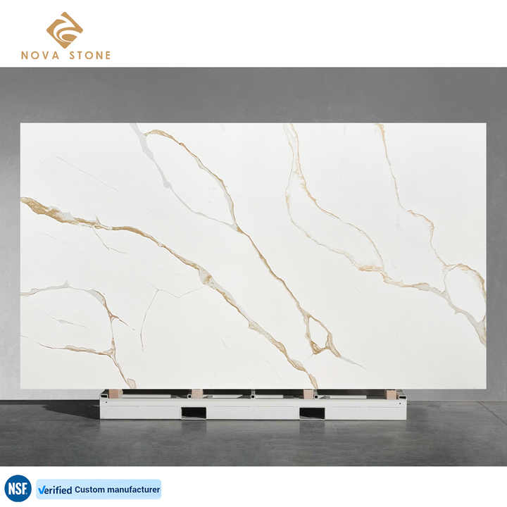 แผ่นหินควอทซ์หนาแบบจัมโบ้แผ่นหินควอทซ์สีทองหรูหราวิศวกรรม NV884ผู้จำหน่ายจากเวียดนาม