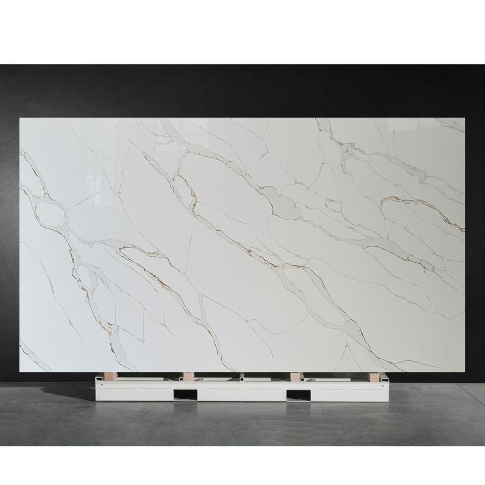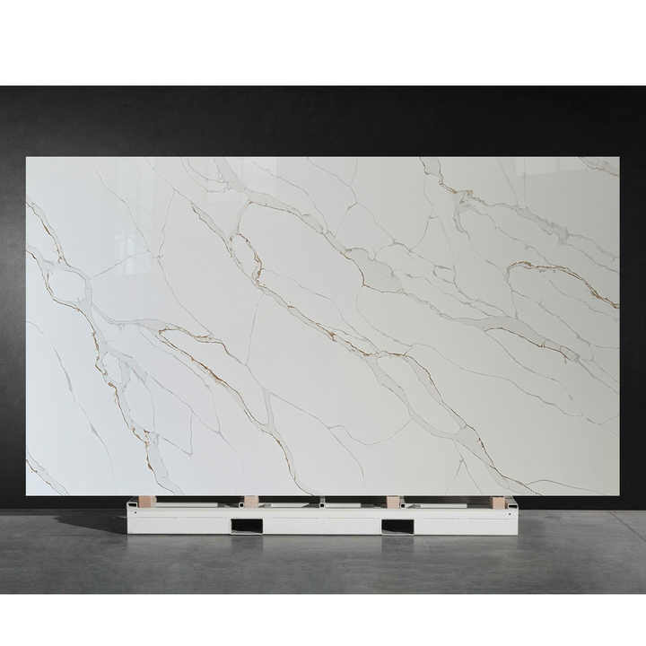 แผ่นควอทซ์ NV912น่าสนใจ Calacatta สีทองกันน้ำเคาน์เตอร์ครัวเชิงพาณิชย์แผ่นหินควอทซ์เทียม