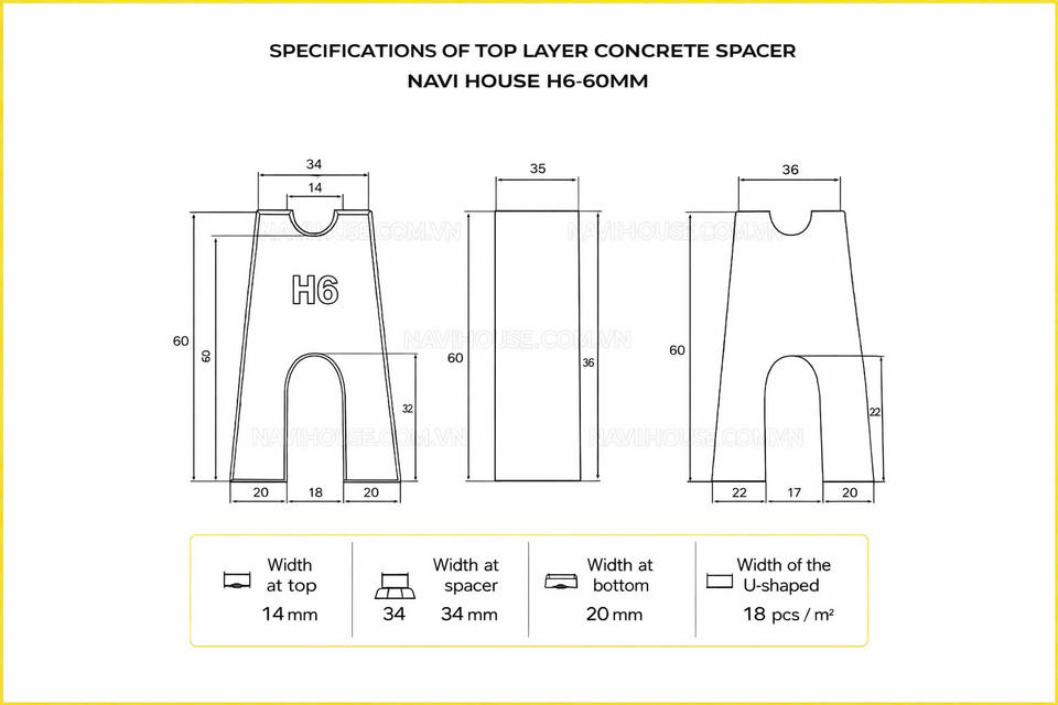 ตัวเว้นระยะคอนกรีต NVH-H6/60 มม. สำหรับปูกระเบื้องภายในอาคาร สำหรับโรงแรม อพาร์ตเมนต์ วิลล่า และห้างสรรพสินค้า