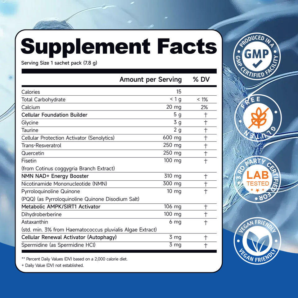 ส่วนผสมหลัก:Trans-Resveratro,Quercetin, NAD+ Energy Booster,Dihydroberberine