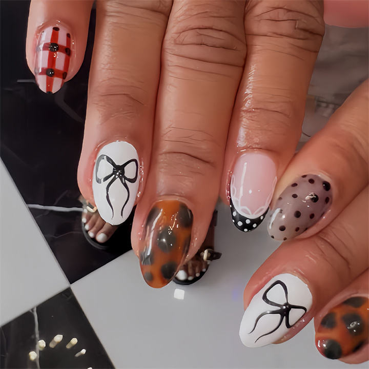 แผ่นติดเล็บลายจุดอัลมอนด์ลงยาทาเล็บฝรั่งเศสลายจุดผลิตภัณฑ์สำเร็จรูปกดเล็บ