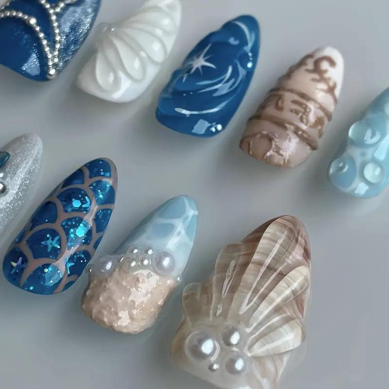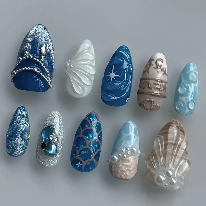 อุปกรณ์ทำเล็บ3D มหาสมุทรสีฟ้าฉลามไข่มุกปลาขนาดอัลมอนด์ที่สวมใส่ได้เคล็ดลับความงามที่กดเล็บสำหรับนิ้วมือฮาลาล