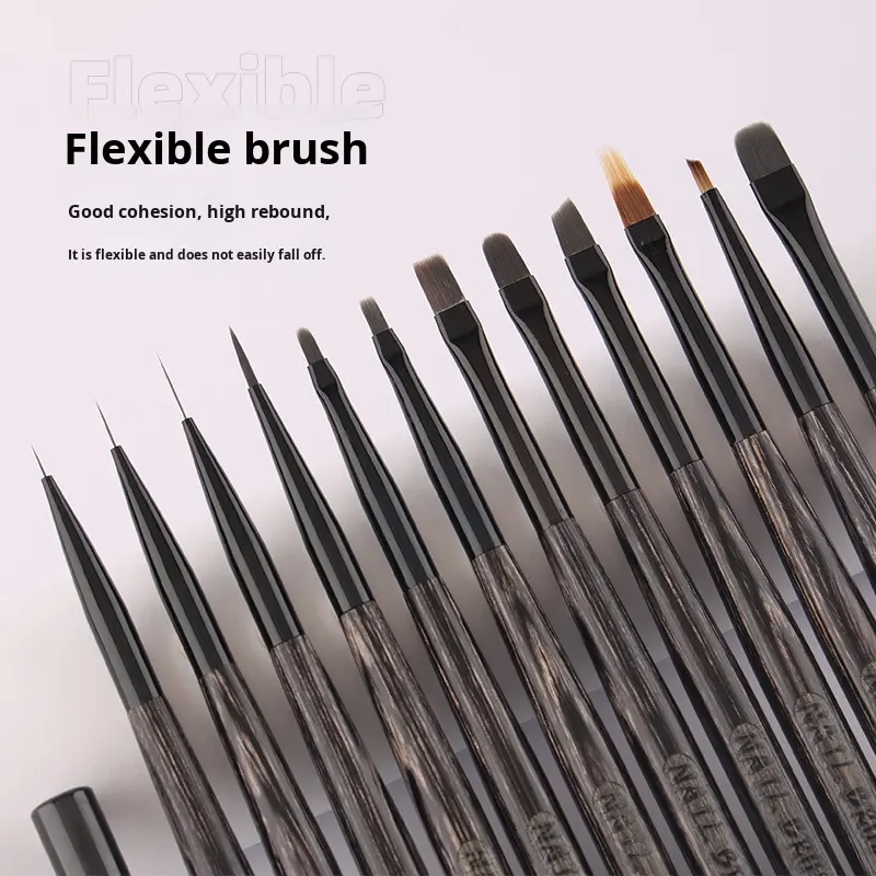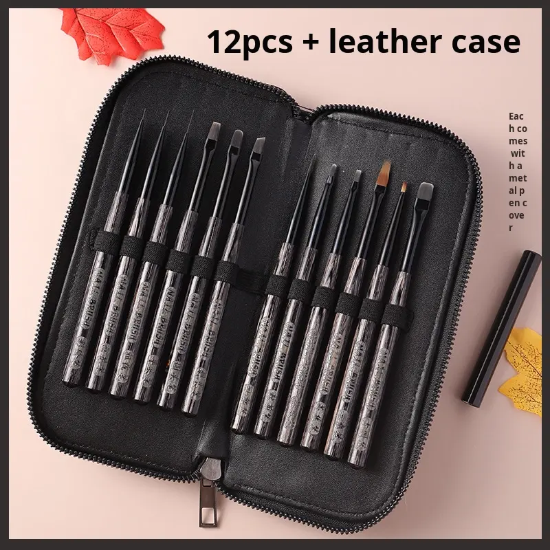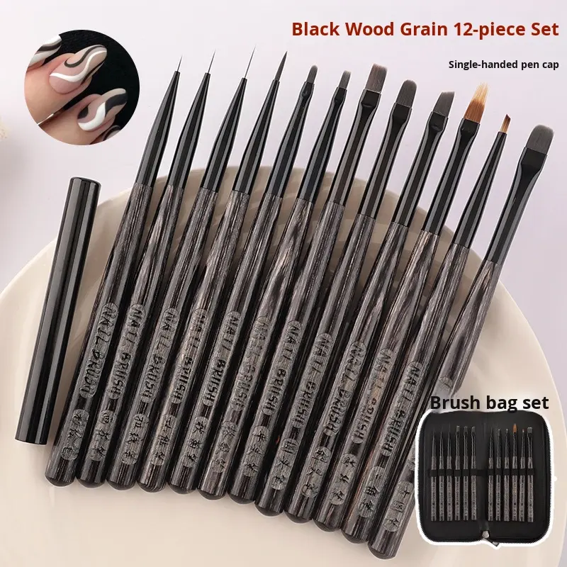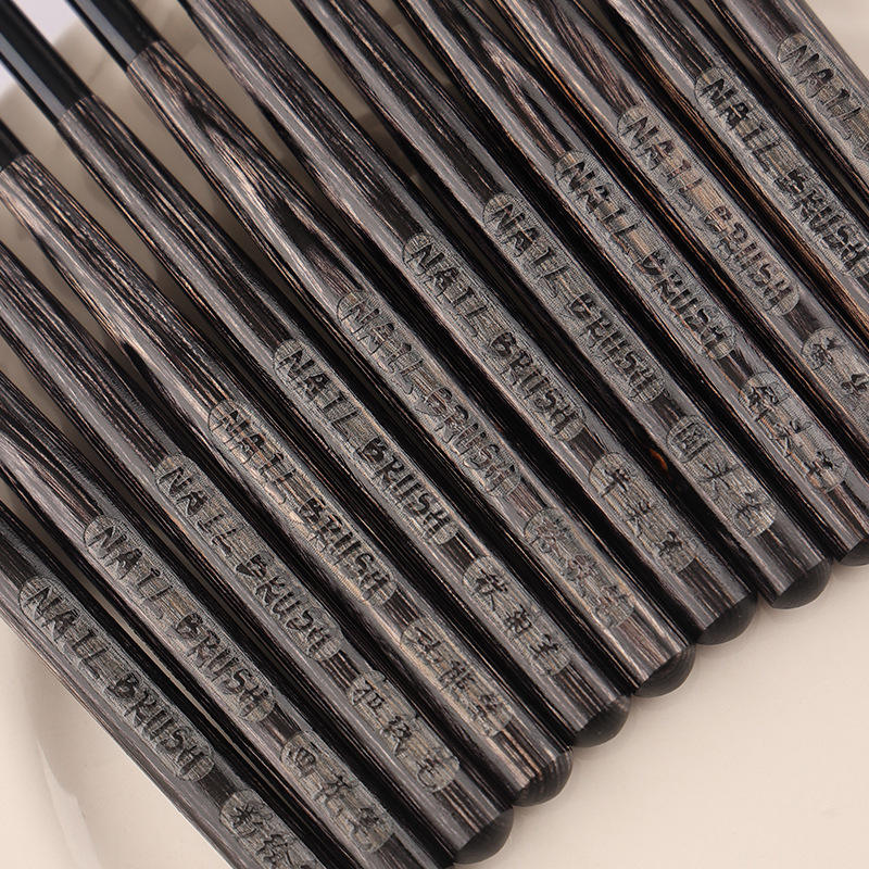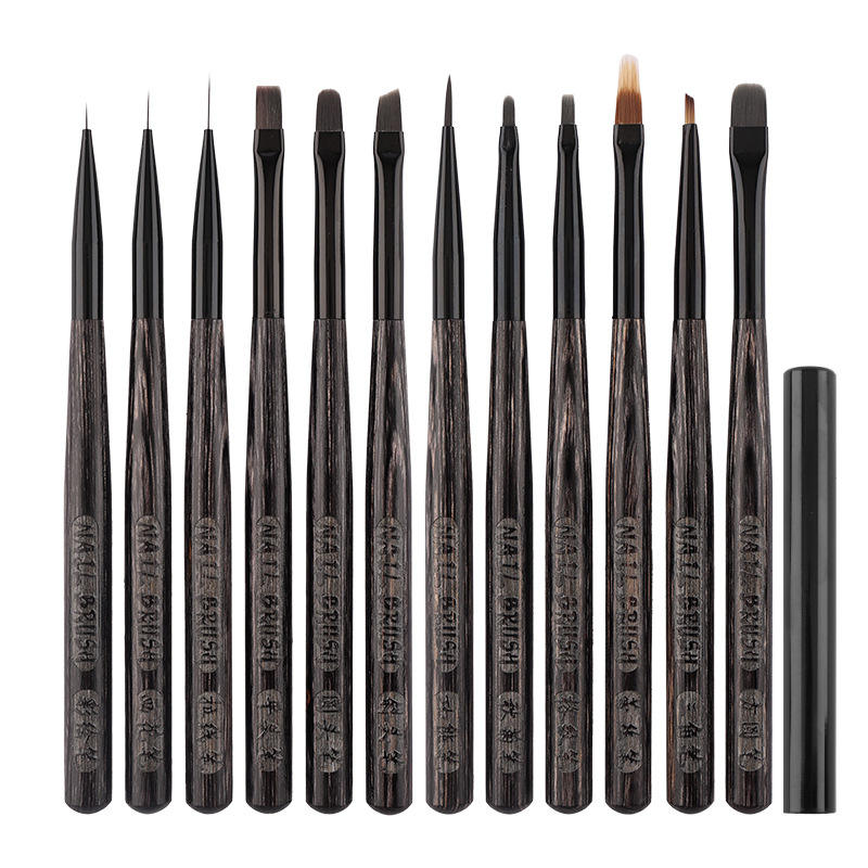 ชุดแต่งเล็บด้ามไม้สีดำสไตล์ญี่ปุ่น12ชิ้นทนทานต่อเล็บพร้อมปากกาเจลยูวีขนสังเคราะห์