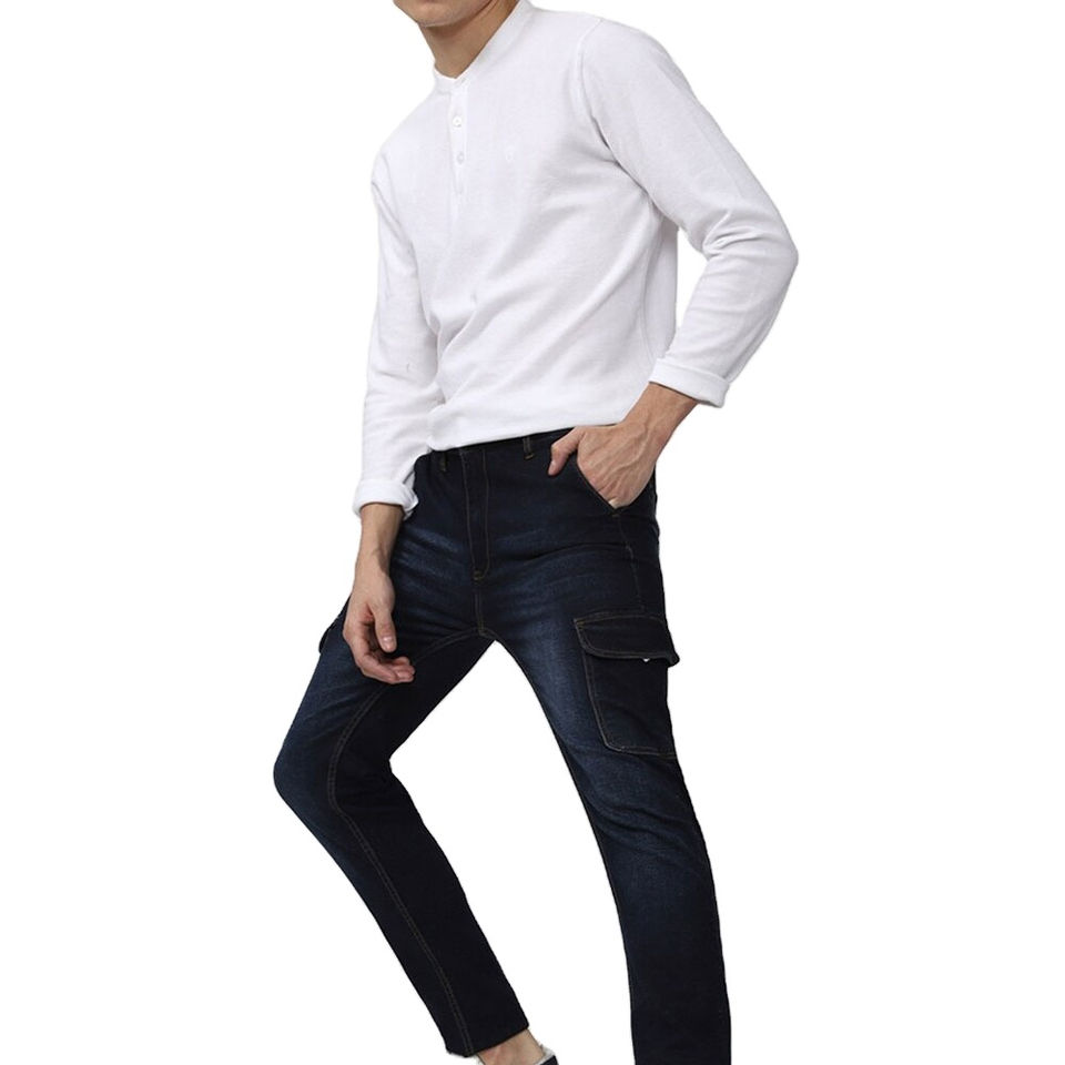 กางเกงยีนส์คาร์โก้ทรงสลิมฟิตสีน้ำเงินเข้มสำหรับผู้ชายจาก Naimat Abbas Industries ผ้าฝ้ายยืดหยุ่น กันน้ำ กันลม ซักแบบสโตนวอช