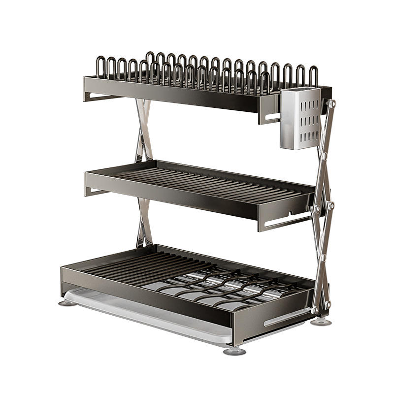 Gunmetal 3-layer folding dish rack and chopstick holder