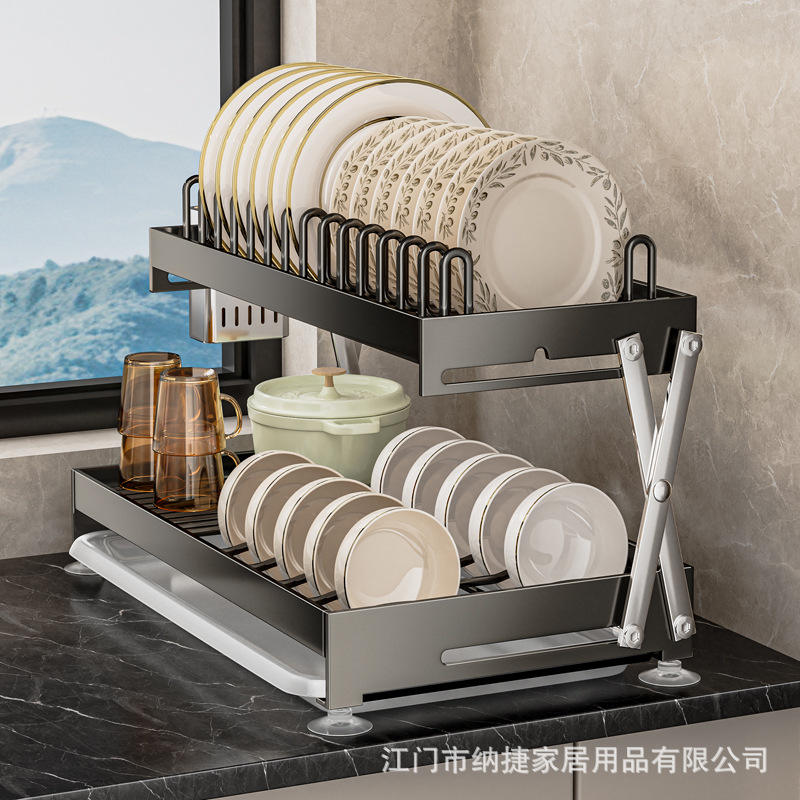 Najia Stainless Steel Double Layer Dish Rack With Tray Folding Countertop Draining Rack For Kitchen L Size
