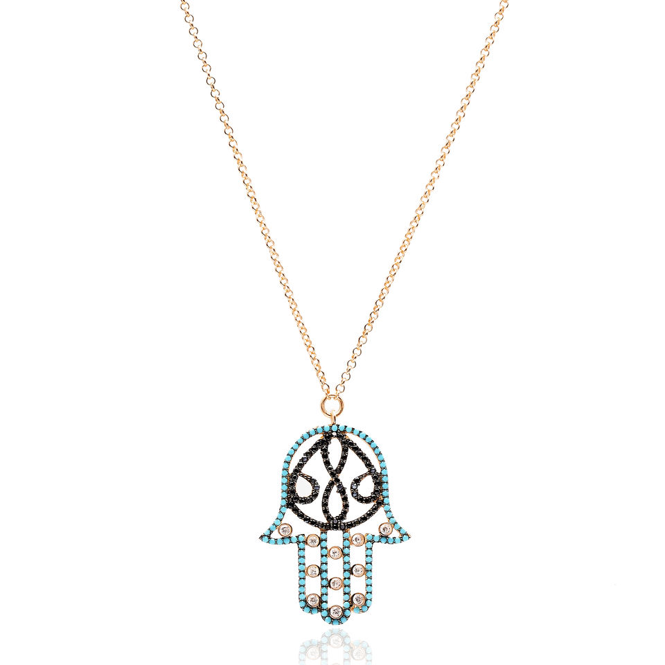 Nano Turquoise Zircon Stone Hamsa Charm Necklace Pendant Turkish Handmade Wholesale 925 Sterling Silver Jewelry