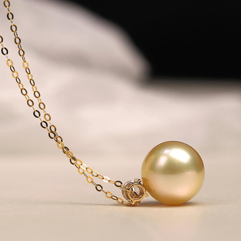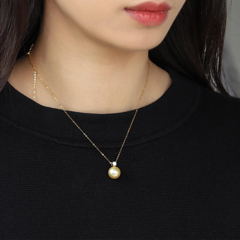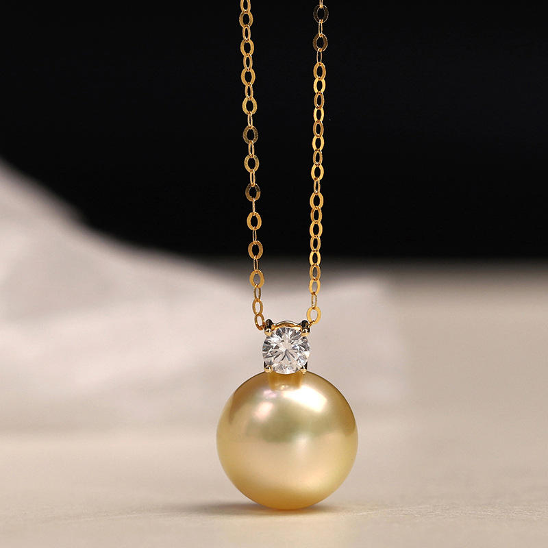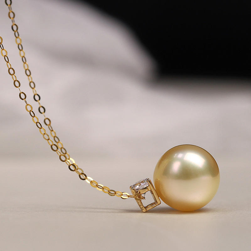 จี้ไข่มุกทะเลสีทองธรรมชาติ 9-13 มม. ยี่ห้อหนานหยาง คุณภาพเยี่ยมไร้ตำหนิ พร้อมสร้อยคอทอง 18k ประดับเพชรซิคอน ดีไซน์หรูหราทันสมัย