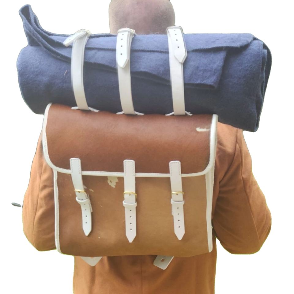 กระเป๋าเป้สะพายหลังแบบนโปเลียน ยุคอาณานิคมศตวรรษที่ 18-19 สำหรับการจำลองสถานการณ์ยุคฝรั่งเศส ทำจากหนังวัว ใช้สำหรับการจำลองสถานการณ์ทางประวัติศาสตร์