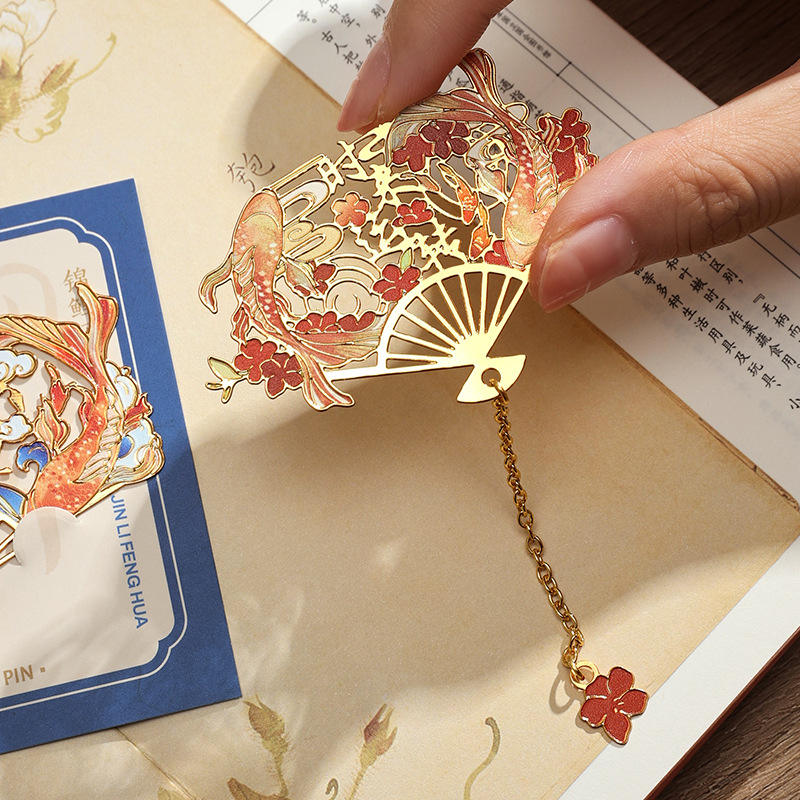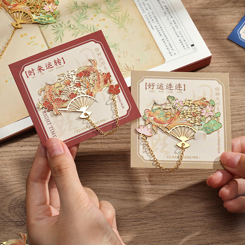 National Trend Creative Metal Chinese Style Fan-Shaped Student Exquisite Prize Good Luck Koi Fish Hollow Bookmark