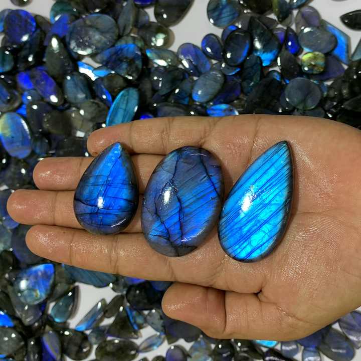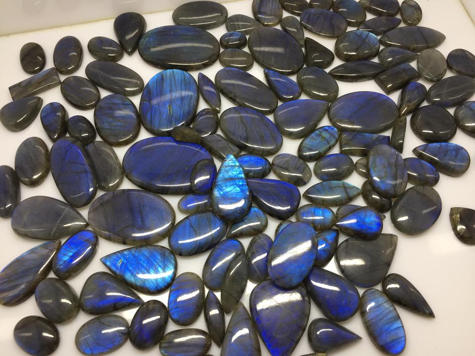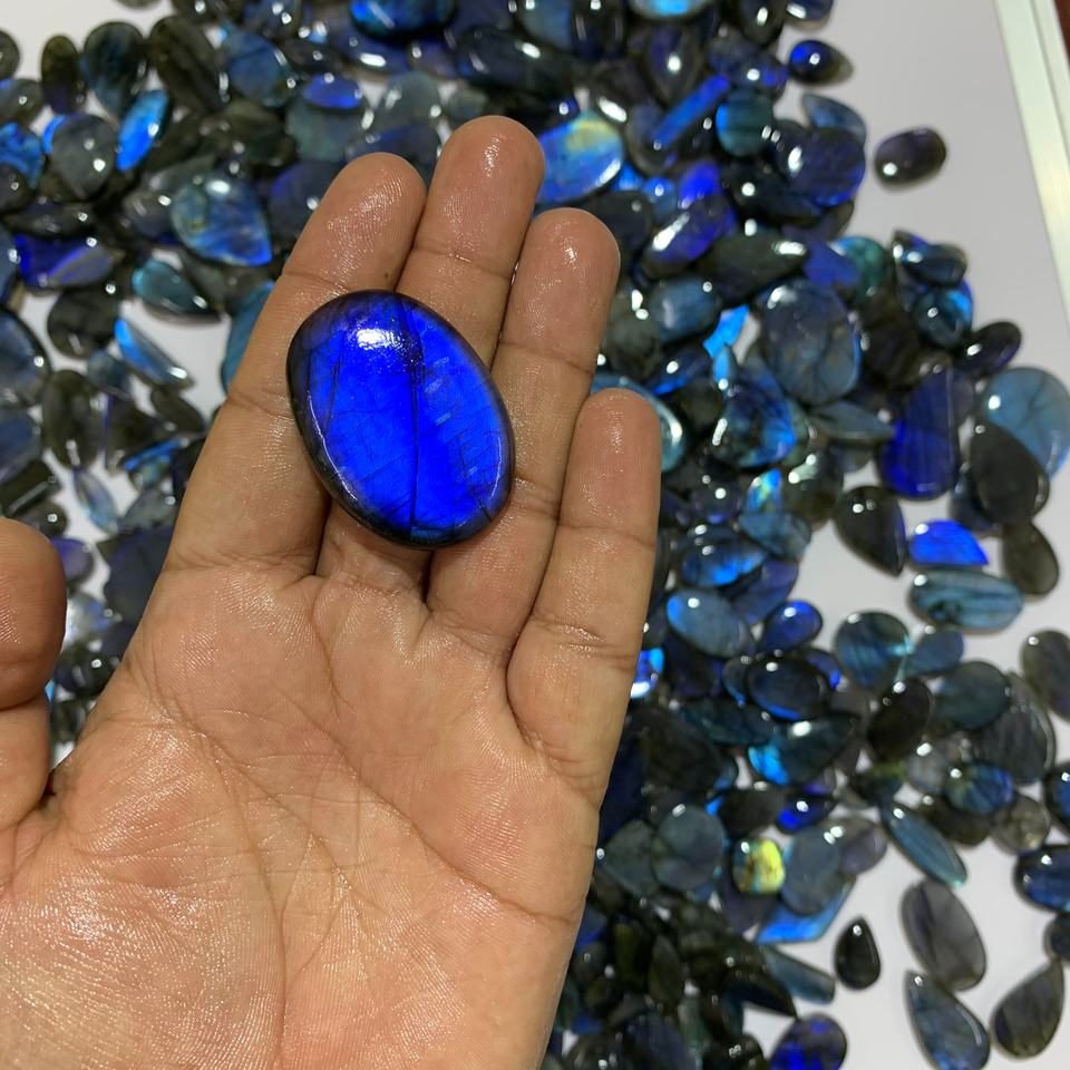 คริสตัลลาบราโดไรต์สีน้ำเงินคุณภาพ AAAAA แบบคาโบชอง สำหรับทำเครื่องประดับ ได้รับการรับรองจาก IGI ขนาดและสีตามสั่ง สามารถเปลี่ยนสีได้