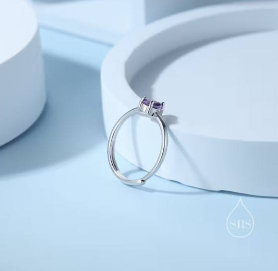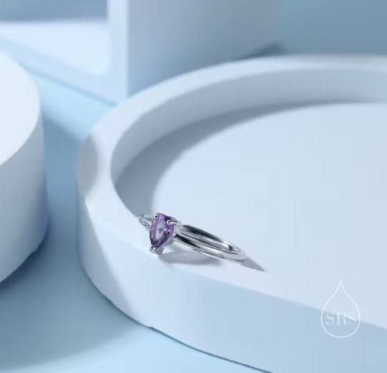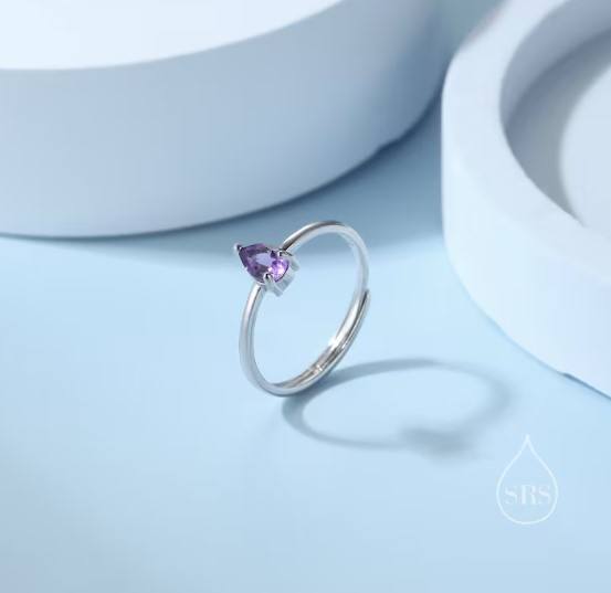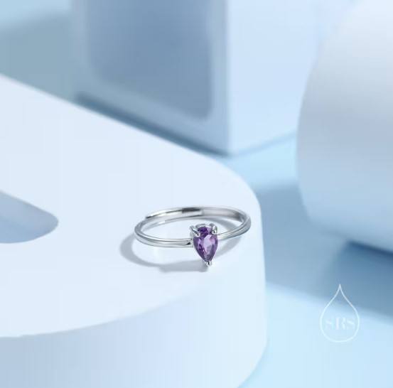 แหวนหยดน้ำอะมีทิสต์ธรรมชาติในตัวเรือนเงินสเตอร์ลิง ขนาด 4x6 มม. ทรงหยดน้ำ ปรับขนาดได้ แหวนอะมีทิสต์แท้ หินประจำเดือนกุมภาพันธ์