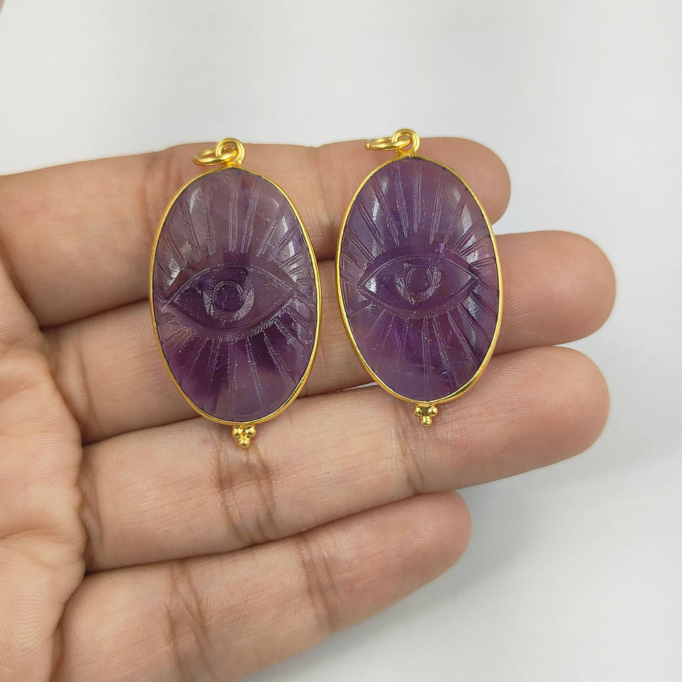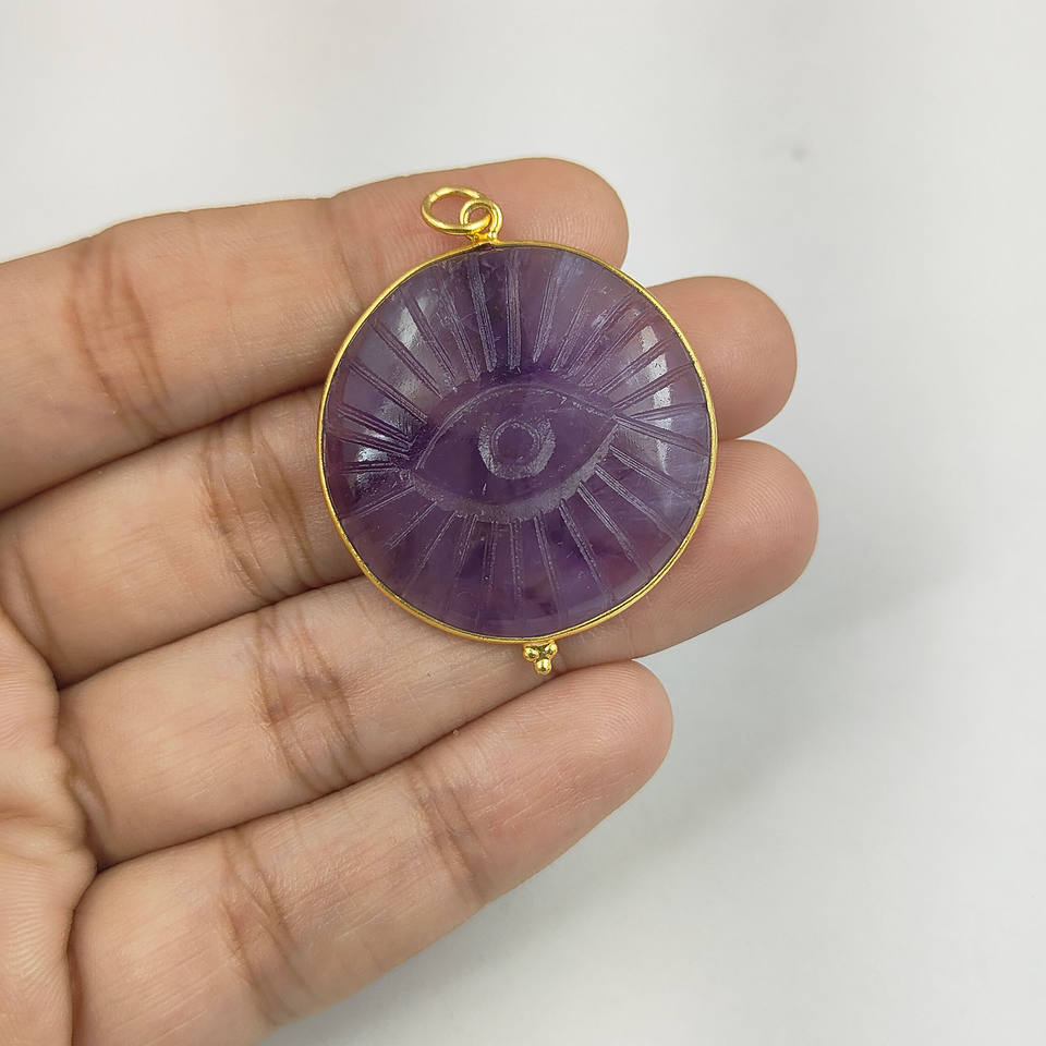 925 Sterling Silver Women's Necklace Pendant Hand Carved Natural Amethyst Evil Eye Christian Religious Symbol