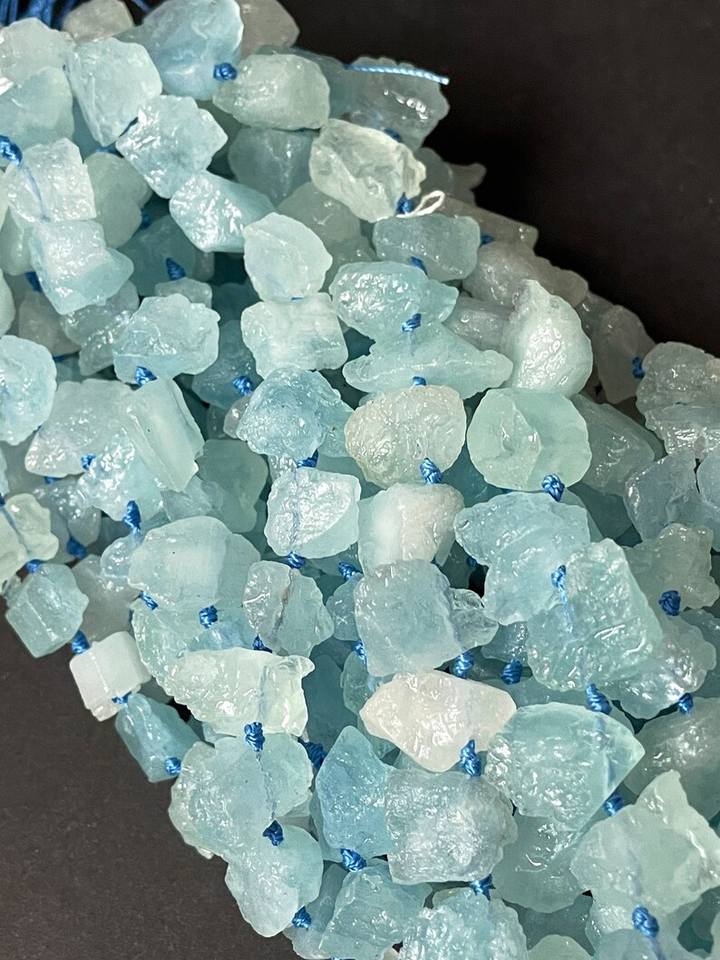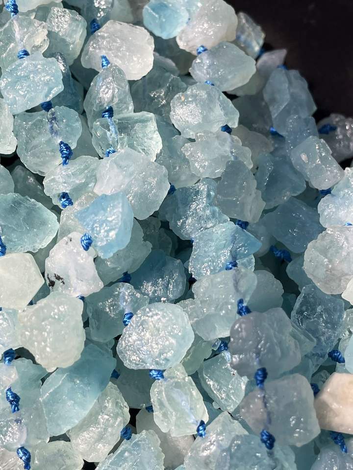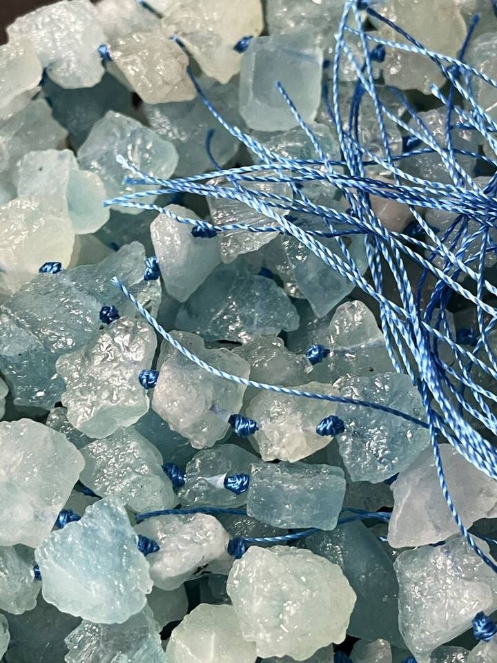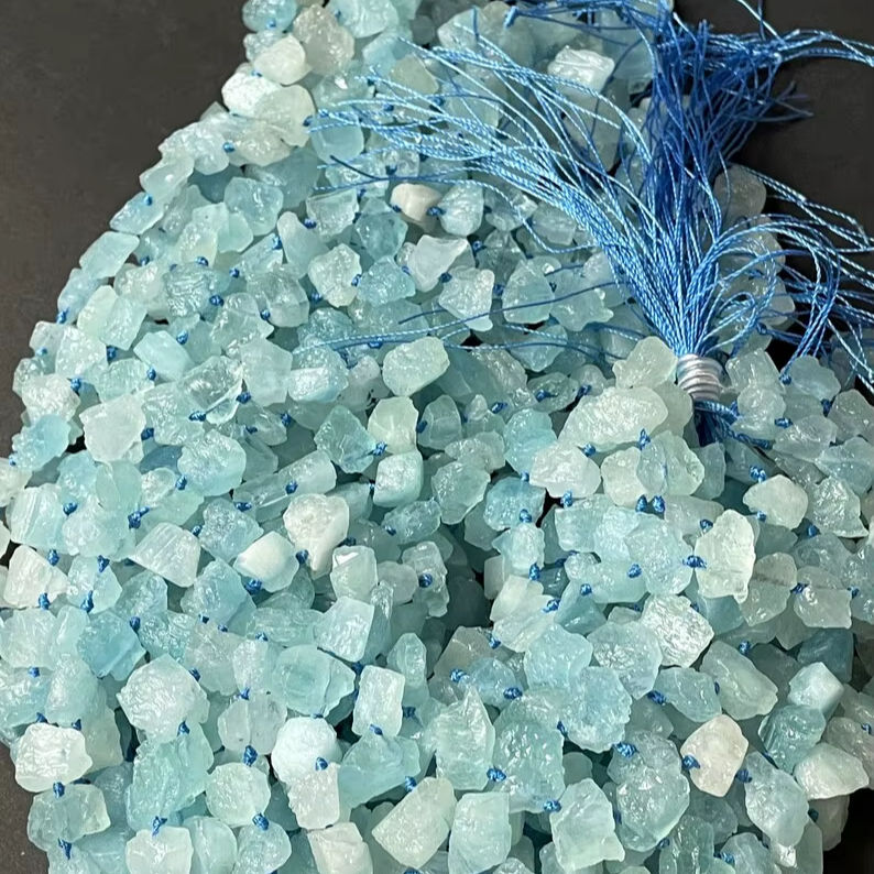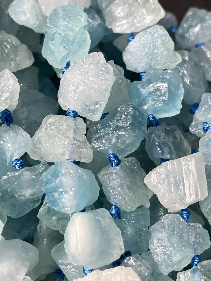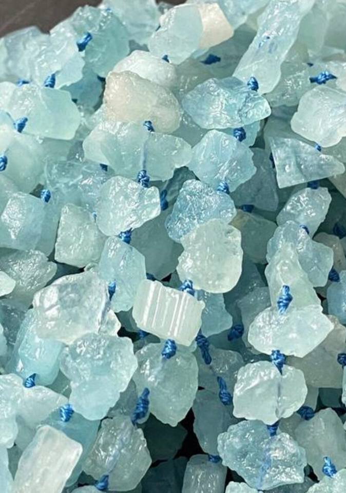 ลูกปัดอะความารีนธรรมชาติทรงก้อน รูปทรงสวยงาม พลอยสีน้ำเงินดิบ ร้อยเป็นเส้นเต็ม สำหรับทำเครื่องประดับ