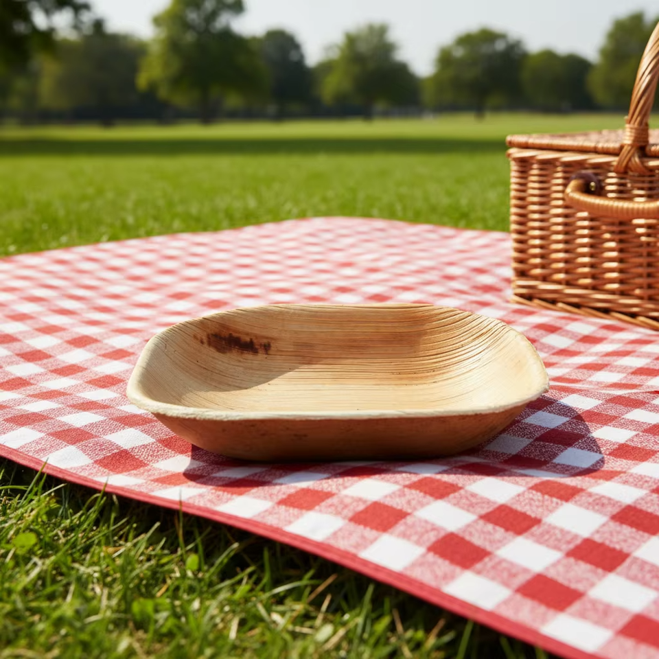 จานใบปาล์มอะรีก้าธรรมชาติขนาด 4 นิ้ว รูปทรงสี่เหลี่ยม จานใช้แล้วทิ้ง เป็นมิตรกับสิ่งแวดล้อม ย่อยสลายได้ เหมาะสำหรับร้านอาหารและผู้จัดเลี้ยง