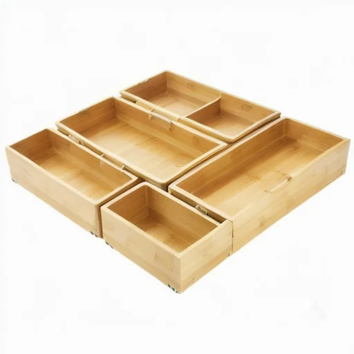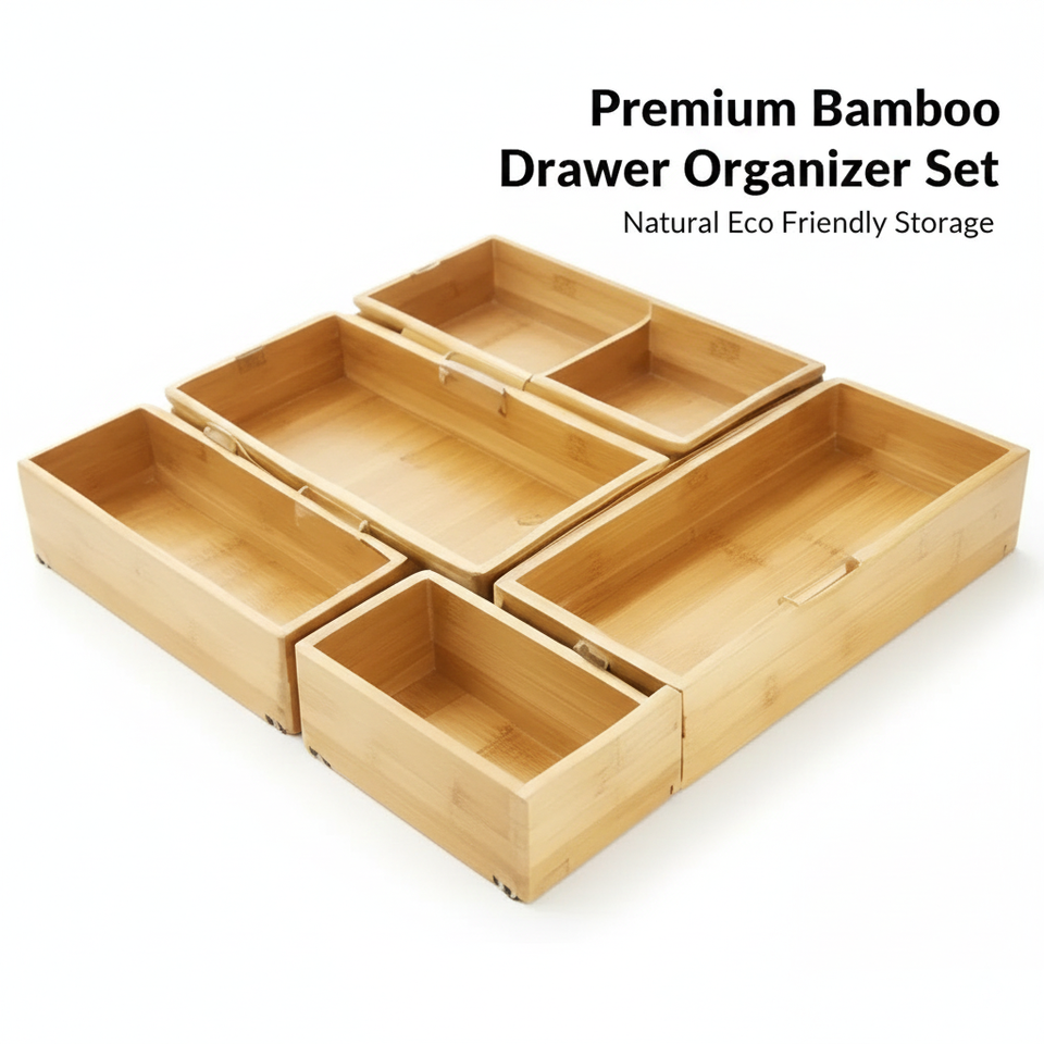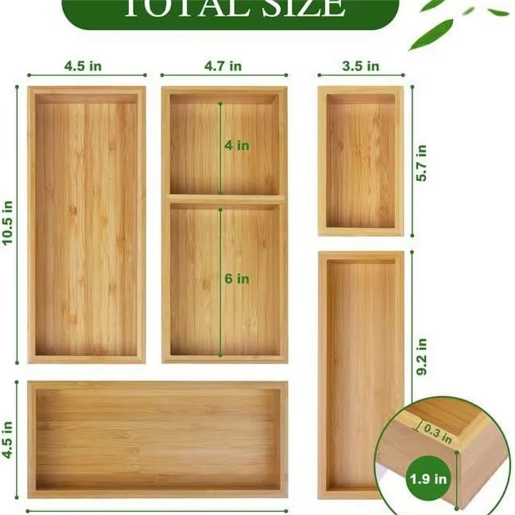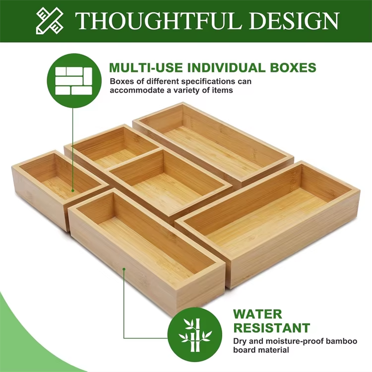 ชุดกล่องจัดระเบียบลิ้นชักไม้ไผ่ธรรมชาติ 5 ชิ้น ถาดใส่ช้อนส้อมในครัว ขยายได้ เป็นมิตรกับสิ่งแวดล้อม กล่องเก็บของในบ้าน