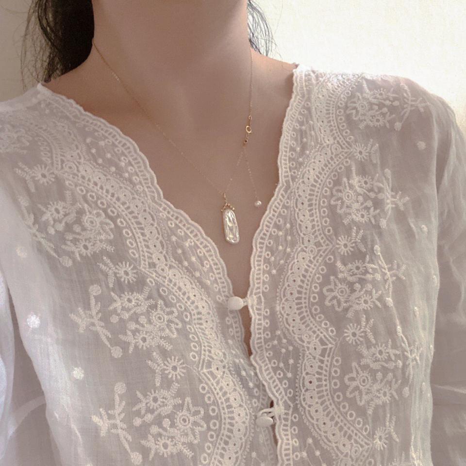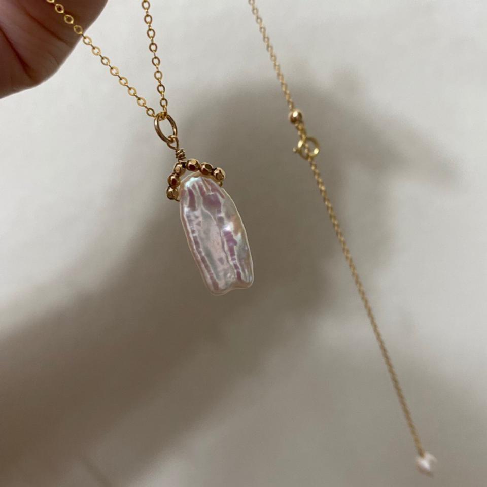 สร้อยคอมุกบาร็อคธรรมชาติรูปทรงไม่สม่ำเสมอ สายหนังจีบแบบคล้องไหปลาร้า พร้อมจี้ยาวประกายเงางาม