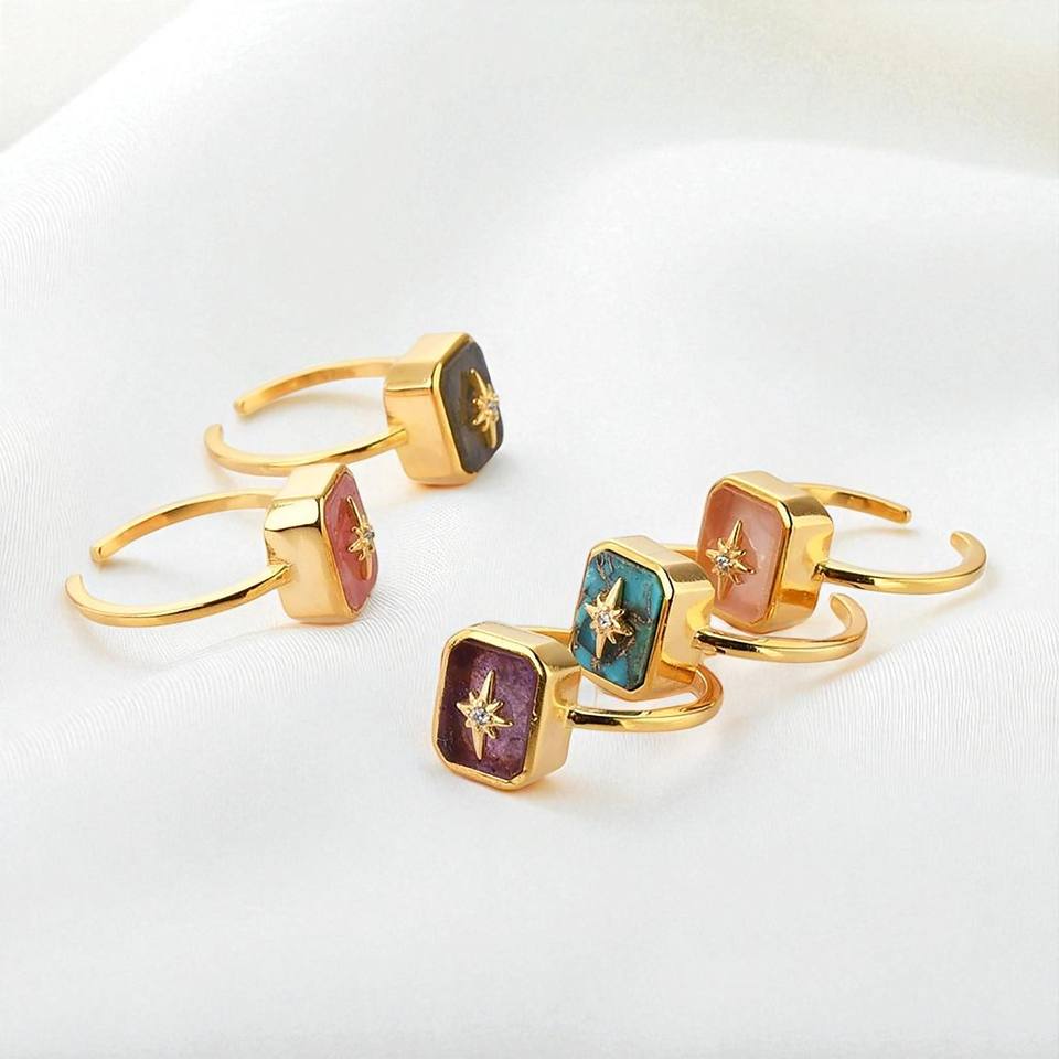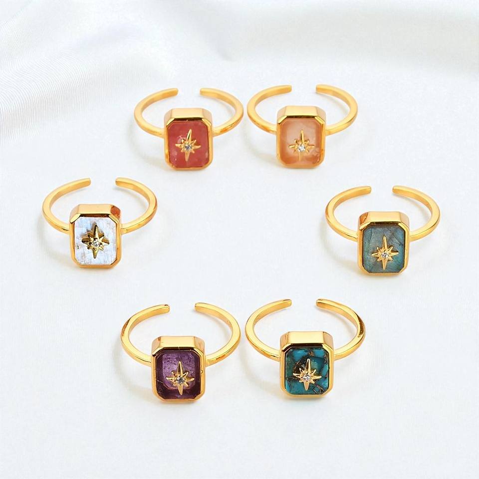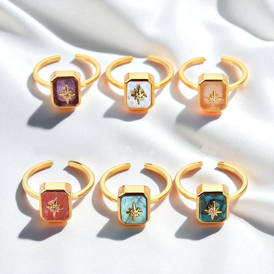 แหวนแฟชั่นดีไซน์เนอร์พลอยมูนสโตนสีรุ้งธรรมชาติ