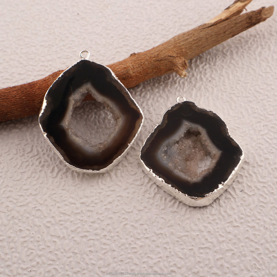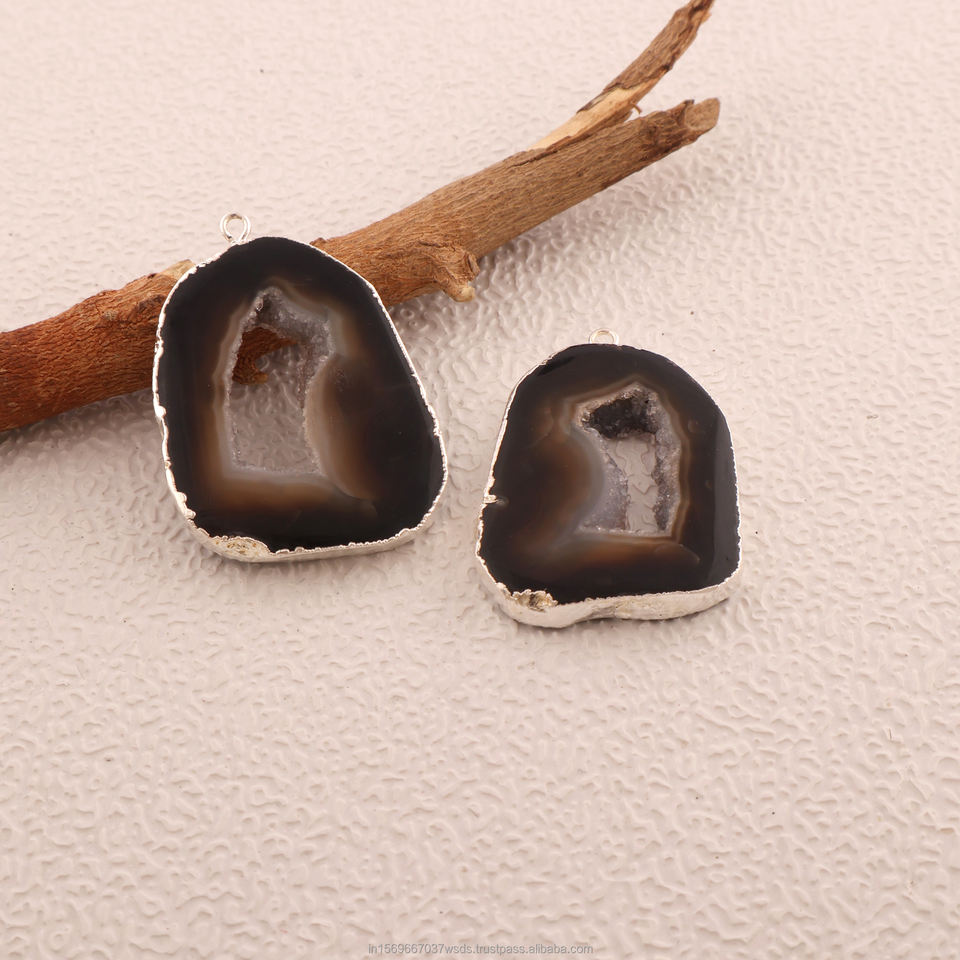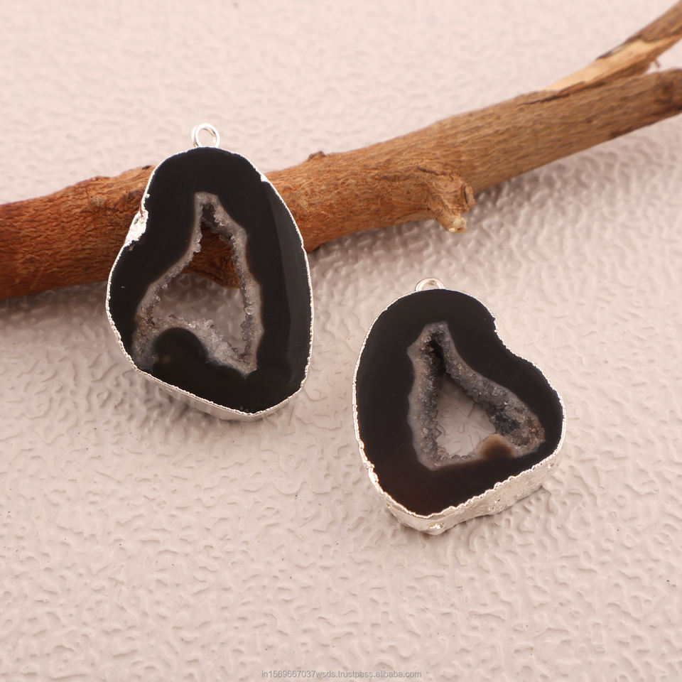 จี้ชิ้นหินโมราสีดำธรรมชาติพร้อมขอบชุบเงินคริสตัลดรูซี่เครื่องประดับทำเครื่องรางสำหรับอุปกรณ์เสริมโบโฮ DIY