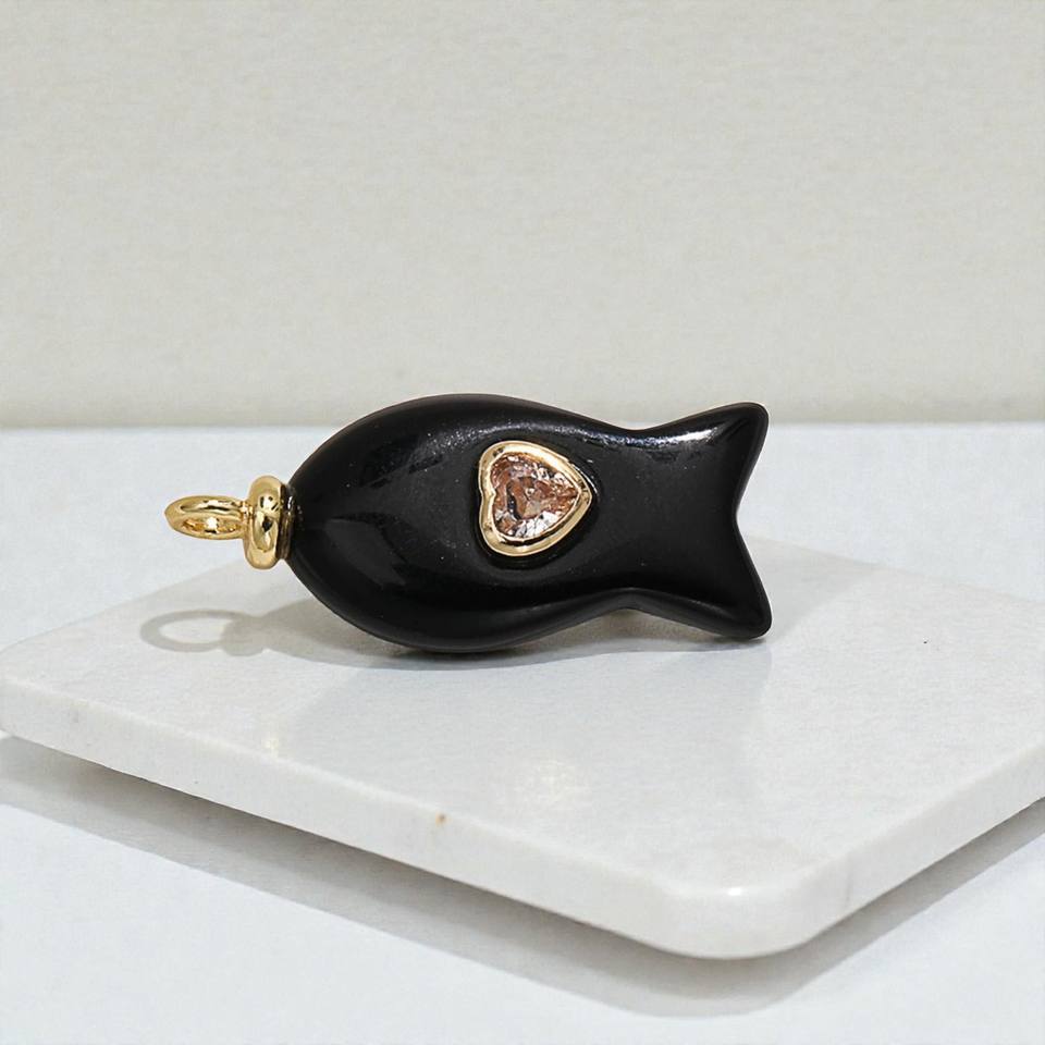 จี้แกะสลักรูปปลาจากหินออนิกซ์สีดำธรรมชาติ - จี้ฝังหินคู่แกะสลักด้วยมือ - เครื่องประดับ DIY 2026