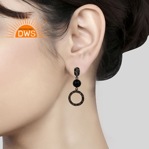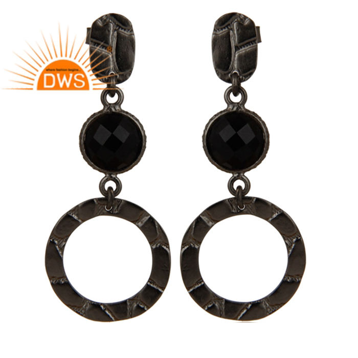 ต่างหูพลอยออนิกซ์สีดำธรรมชาติจากซัพพลายเออร์ ต่างหูเงินแท้ 925 แบบห้อยประดับด้วยพื้นผิวออกซิไดซ์สีดำ