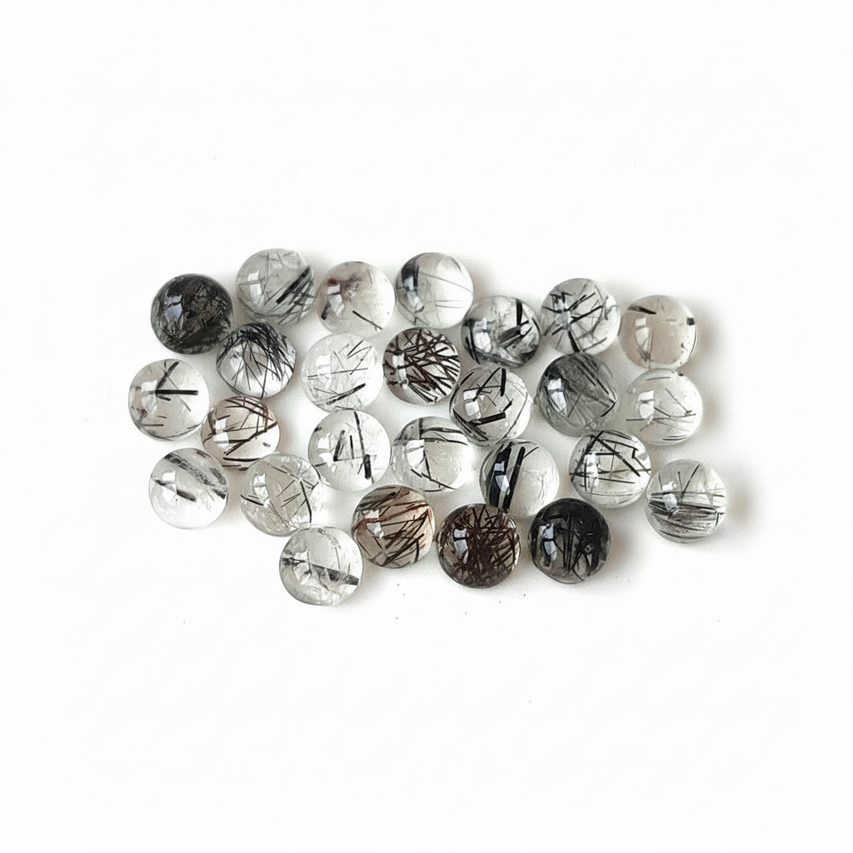 พลอยรูไทล์สีดำธรรมชาติ ขนาด 3 มม.-8 มม. ทรงกลมแบบคาโบชอง หลังแบน สำหรับทำเครื่องประดับ ราคาขายส่ง