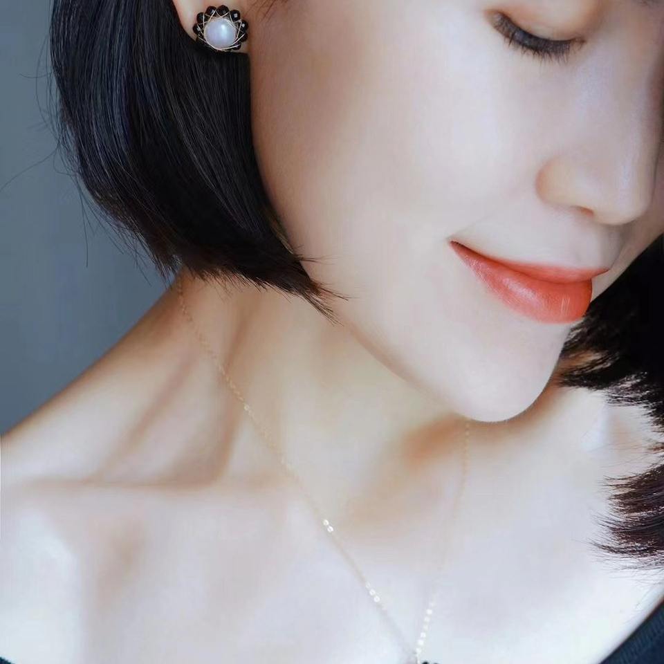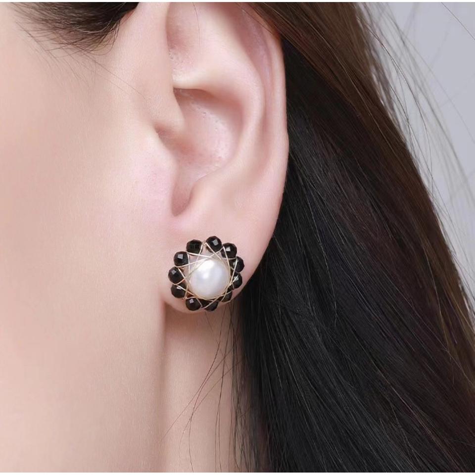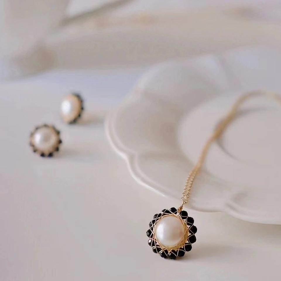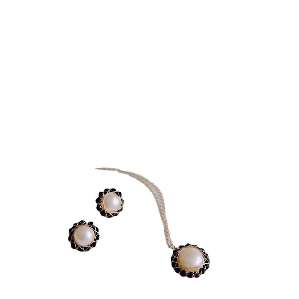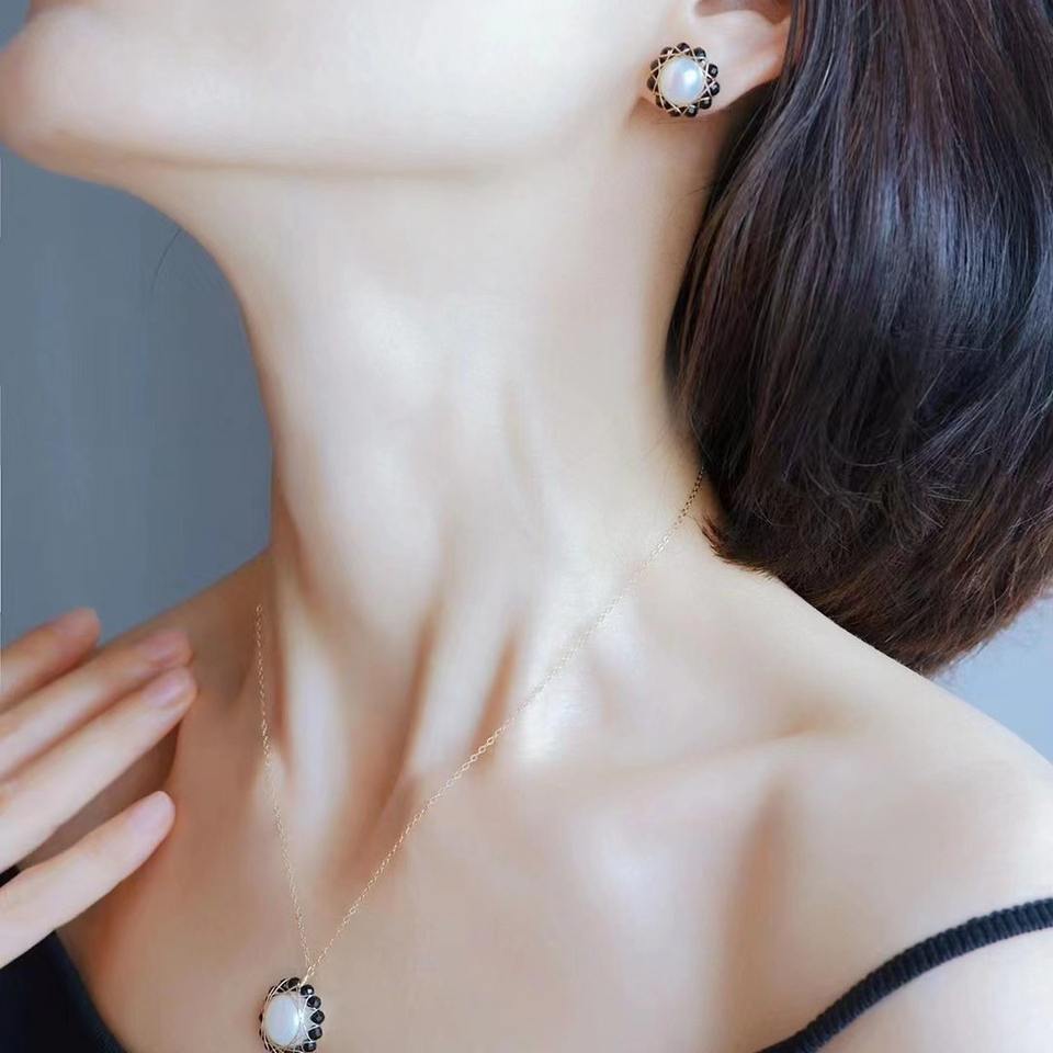 ชุดเครื่องประดับดีไซน์เฉพาะตัว ประกอบด้วยต่างหูเงินแท้ S925 ประดับพลอยสปิเนลสีดำธรรมชาติ และสร้อยคอไข่มุกน้ำจืด