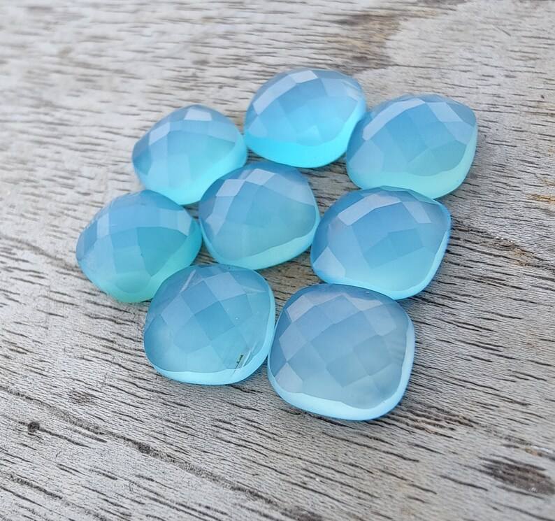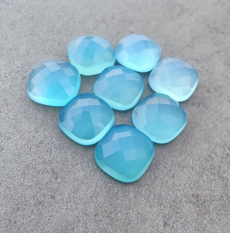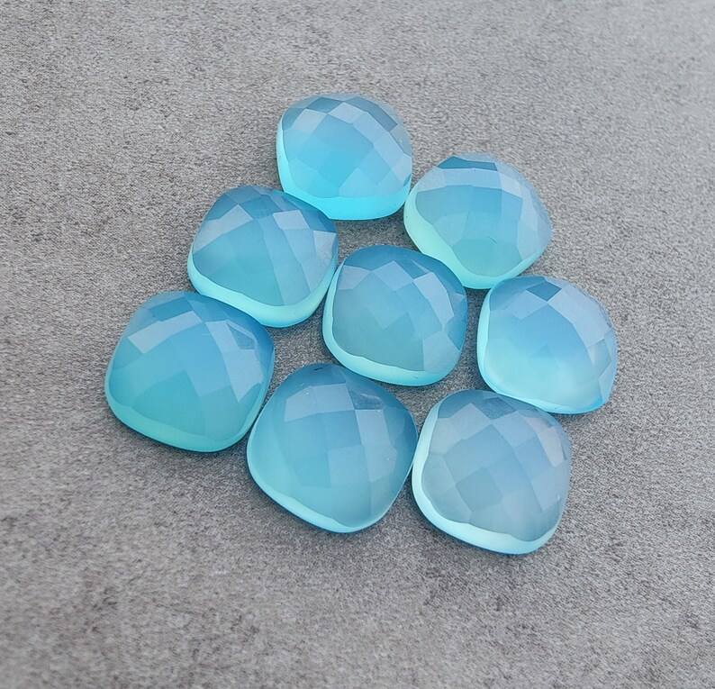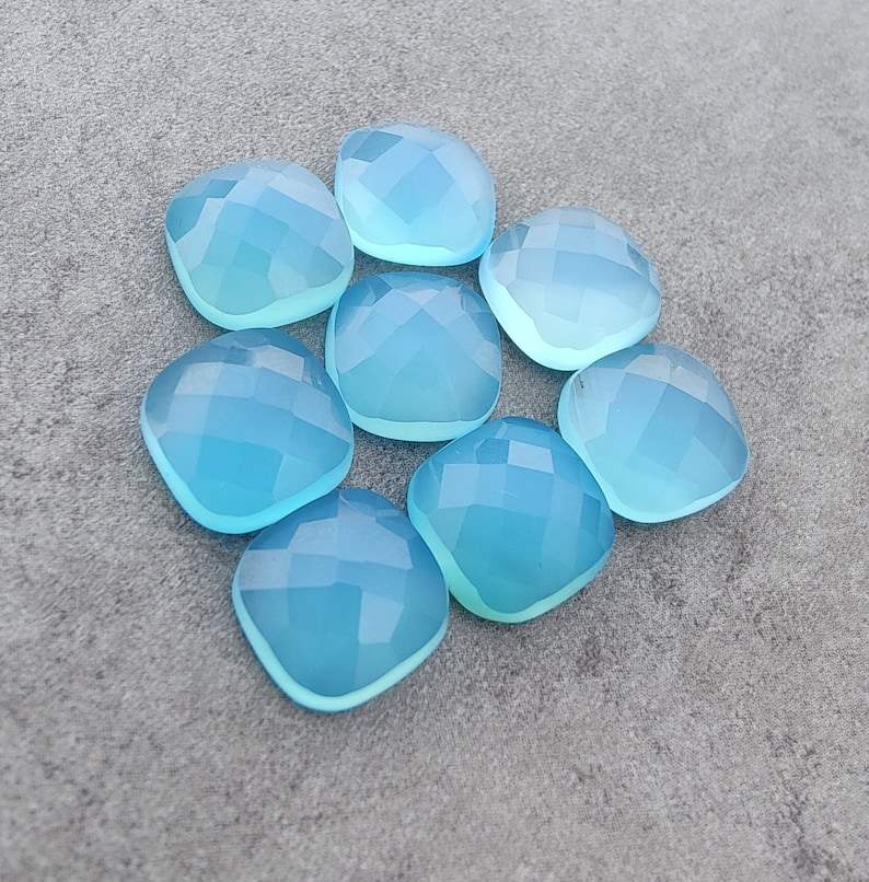 พลอยแคลเซโดนีสีน้ำเงินธรรมชาติ รูปทรงสี่เหลี่ยมแบบคุชชั่น เจียระไนแบบเช็คเกอร์ ขนาดปรับเทียบแล้ว สำหรับทำเครื่องประดับ