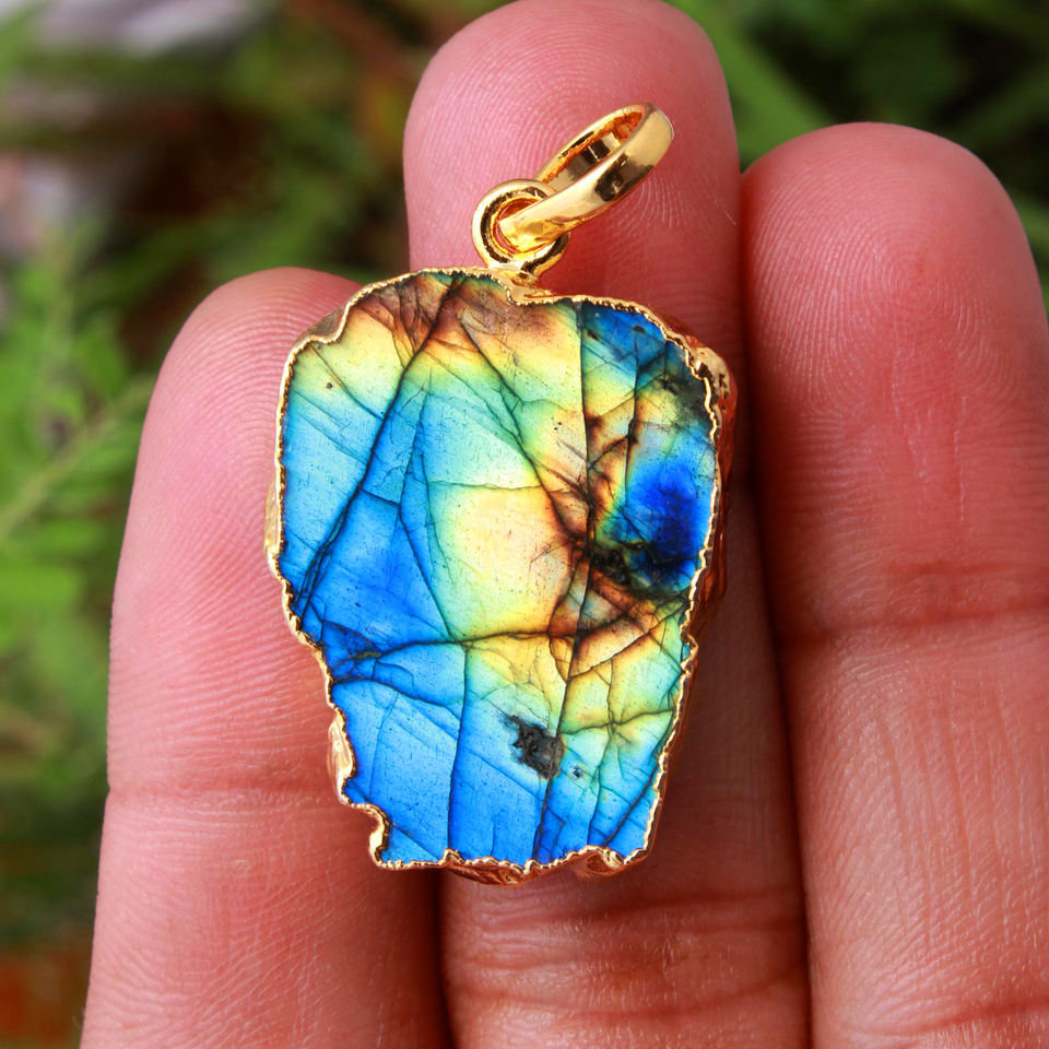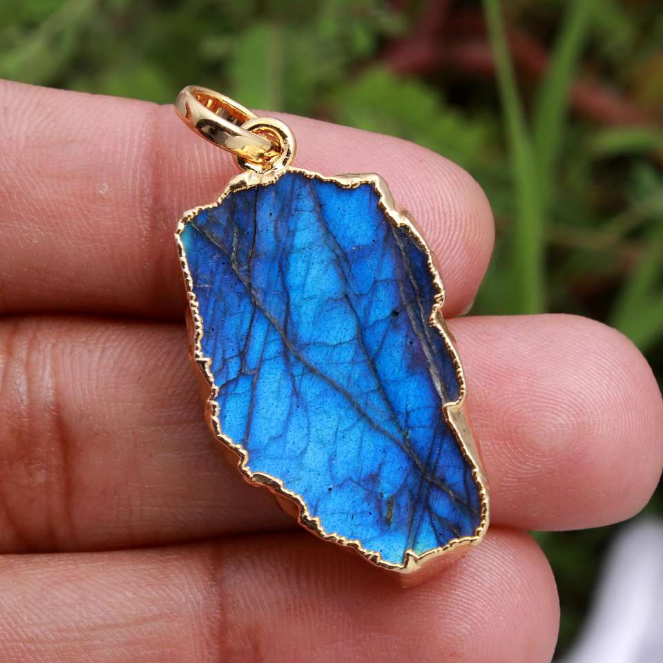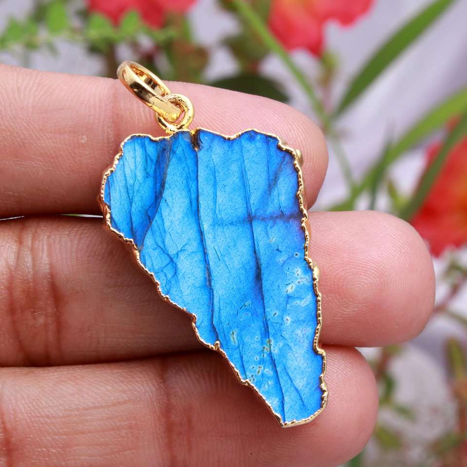 จี้เครื่องประดับหินไฟลาบราดอไรต์สีฟ้าตามธรรมชาติชุบโลหะด้วยไฟฟ้าแบบโบฮีเมียน