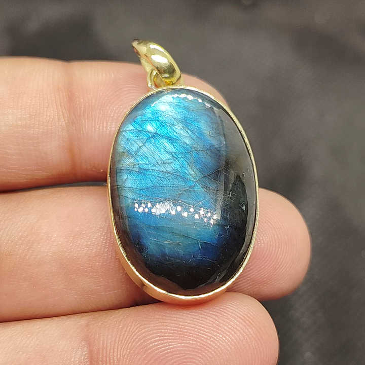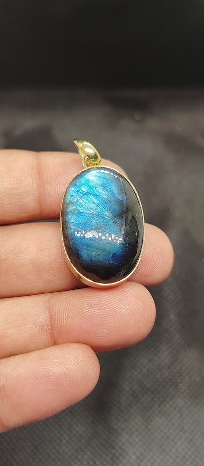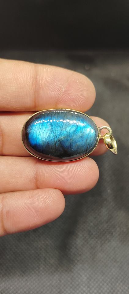 จี้สร้อยคอลาบราดอไรต์สีน้ำเงินธรรมชาติ ผิวสัมผัสแบบมีเท็กซ์เจอร์ ตัวเรือนทองเหลืองชุบทอง ประดับขอบด้วยทองคำ