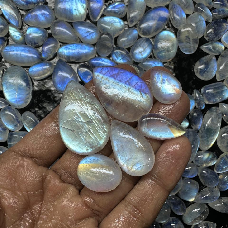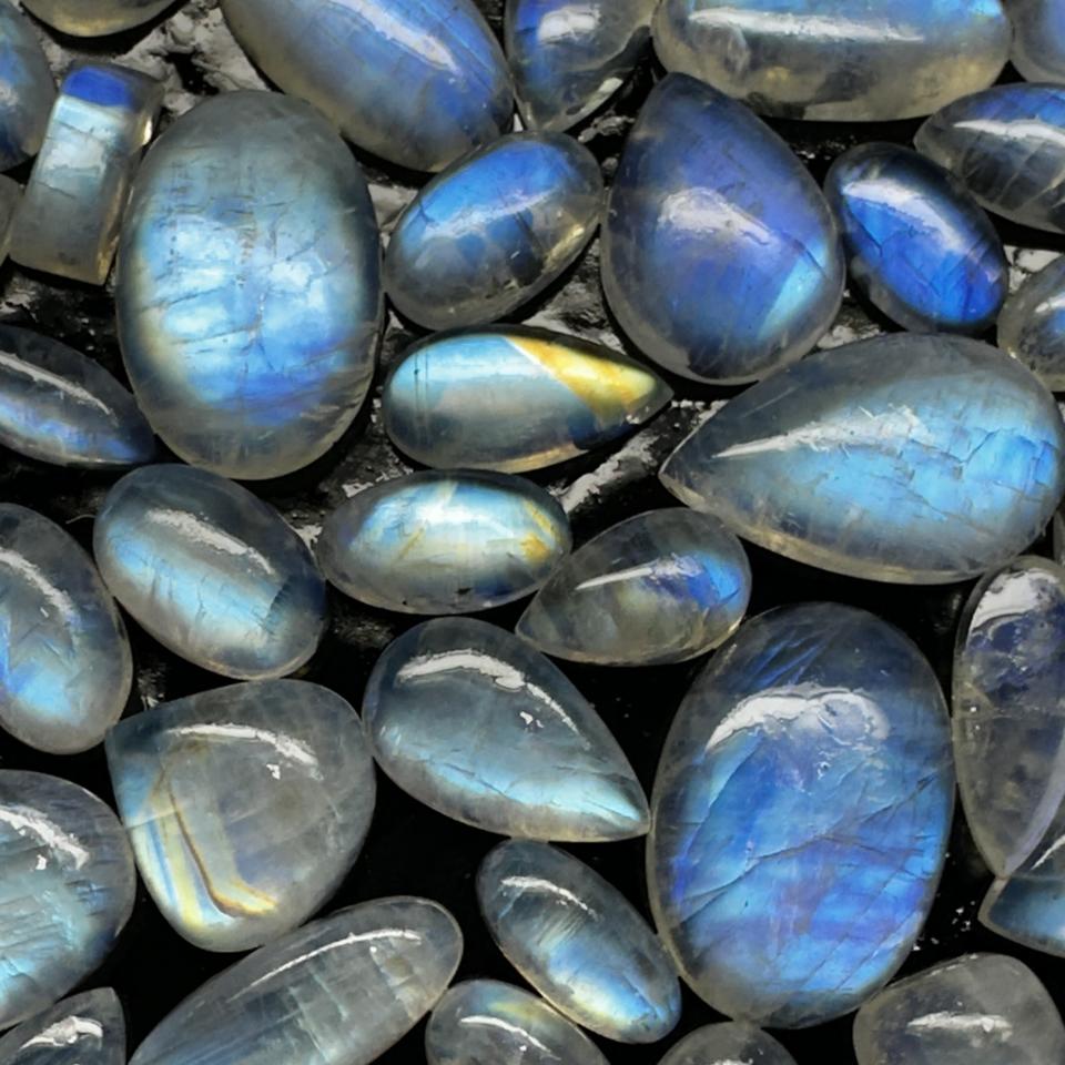 มูนสโตนสีน้ำเงินธรรมชาติ รูปไข่ แบบคาโบชอง ด้านหลังแบน มีหลายขนาดให้เลือกสำหรับงานประดิษฐ์เครื่องประดับ