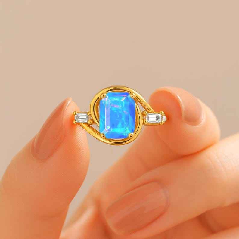แหวนโอปอลแปดเหลี่ยมสีฟ้าธรรมชาติแหวนโอปอลหลากไฟ925สเตอร์ลิงเงิน14K ชุบทองแหวนโอปอลของขวัญวันเกิด