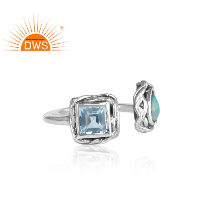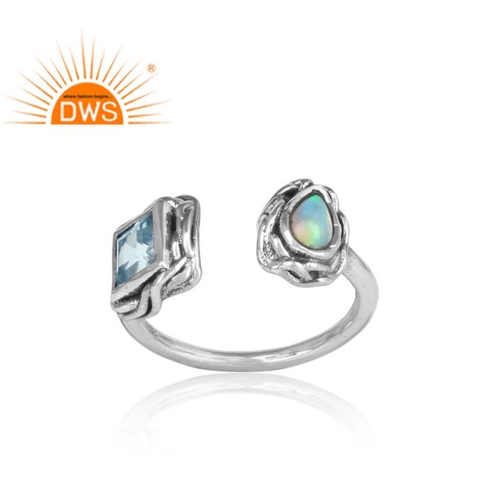 แหวนเงินแท้ 925 ชุบออกซิไดซ์ ปรับขนาดได้ ประดับด้วยบลูโทแพซธรรมชาติและโอปอลเอธิโอเปีย ดีไซน์ทันสมัย เหมาะสำหรับงานแต่งงาน งานครบรอบ และงานปาร์ตี้