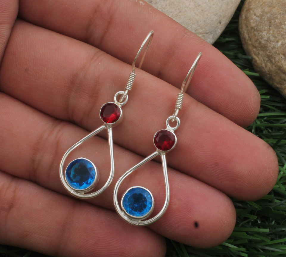 Natural Blue Topaz Garnet Drop Earrings 925 Sterling Silver Multi Gemstone Luxury Dainty Red Blue Stone Jewelry for Women Gift