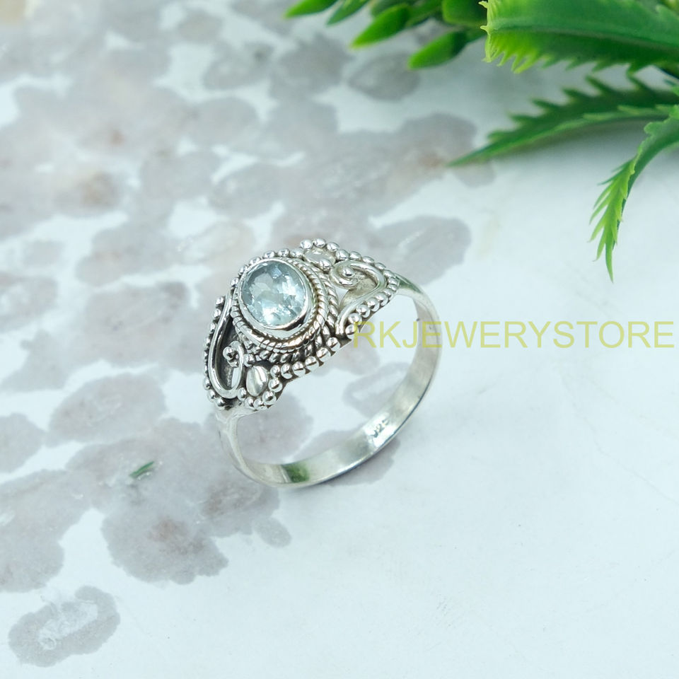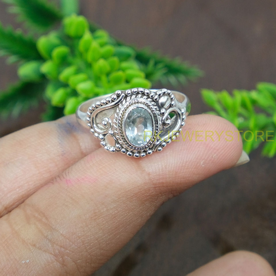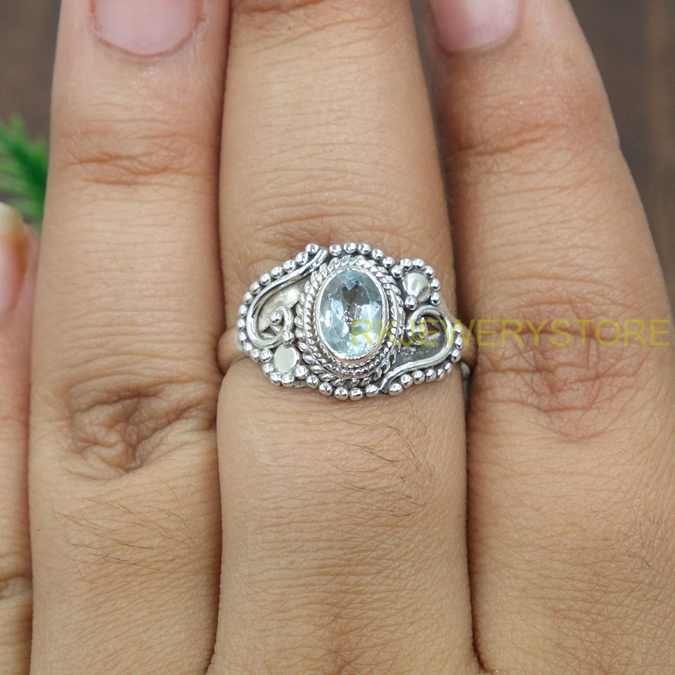 แหวนบลูโทแพซธรรมชาติ เงินแท้ 925 ทำมือ สไตล์วินเทจ โบโฮ เครื่องประดับโดดเด่น แหวนพลอยรูปไข่เหลี่ยมเพชรพลอย สำหรับผู้หญิง