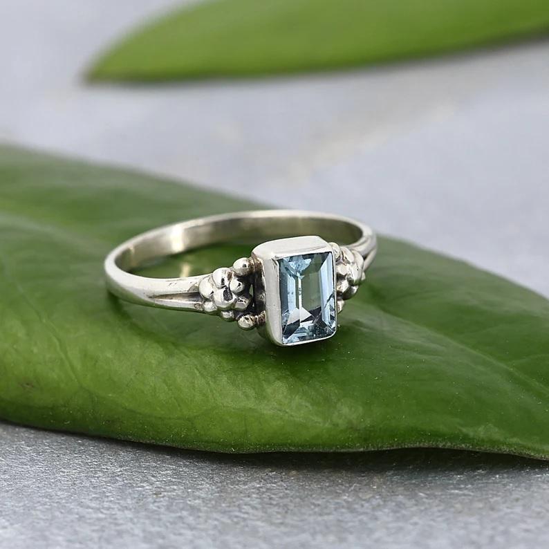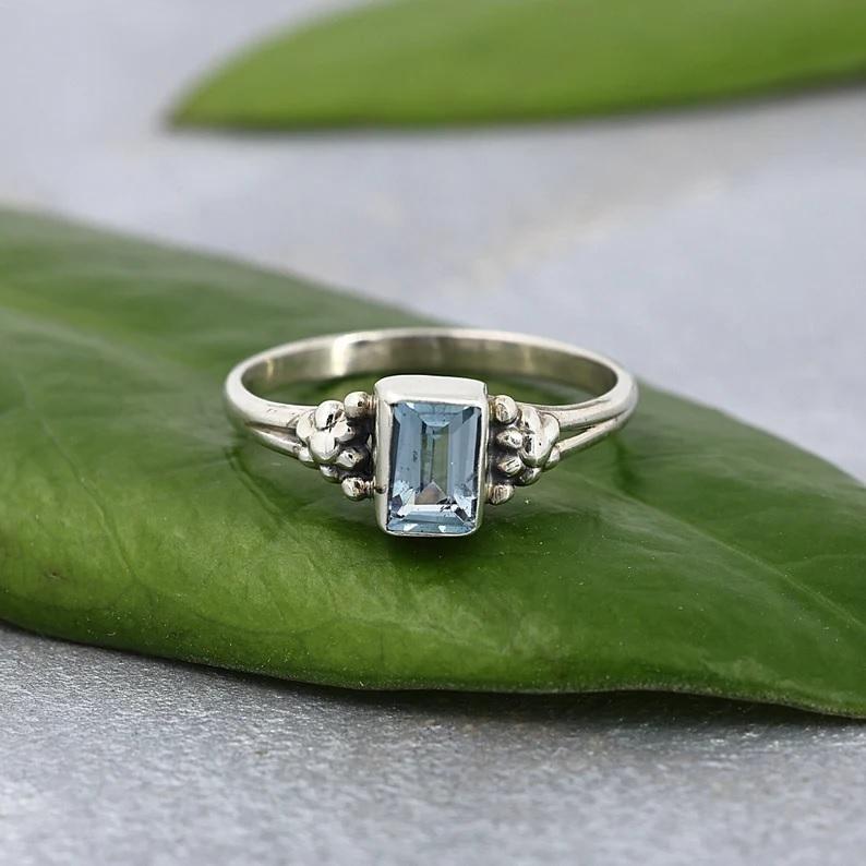 แหวนบุษราคัมสีฟ้าธรรมชาติสำหรับ925เธอแหวนซ้อนกันได้สไตล์บาแกตต์มินิมอลลิสต์ของขวัญสำหรับผู้หญิง