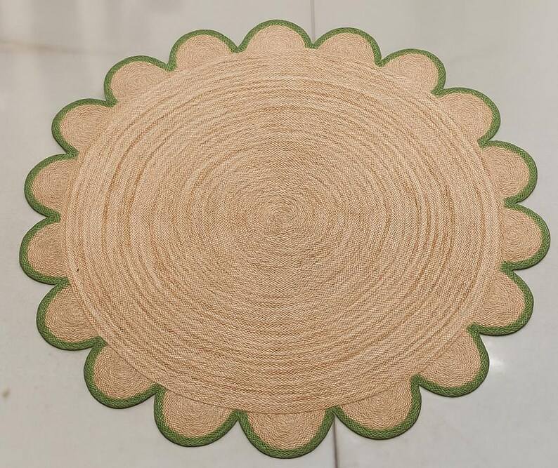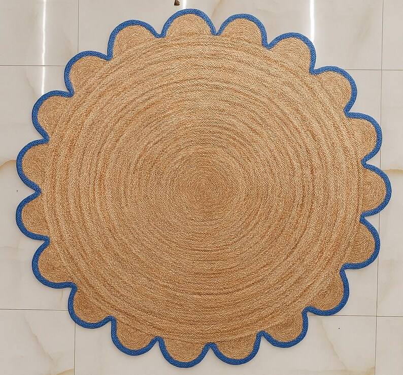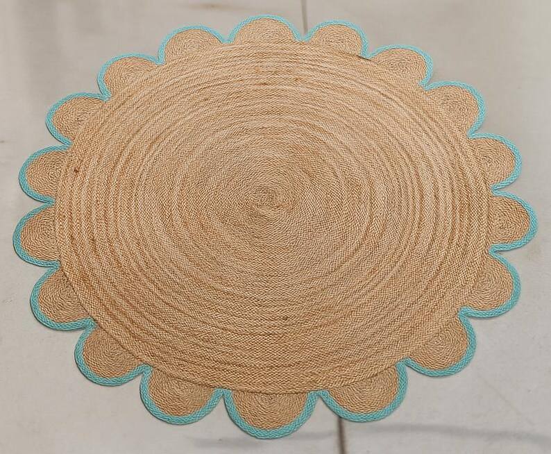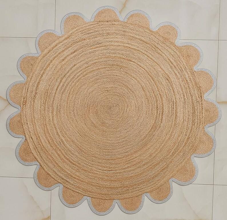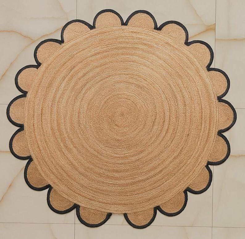 พรมปูพื้นสไตล์โบโฮทำมือจากเส้นใยปอกระเจา ขอบหยักเป็นลอน ตกแต่งห้องนั่งเล่นหรือห้องนอนสไตล์เรียบง่ายแต่หรูหรา
