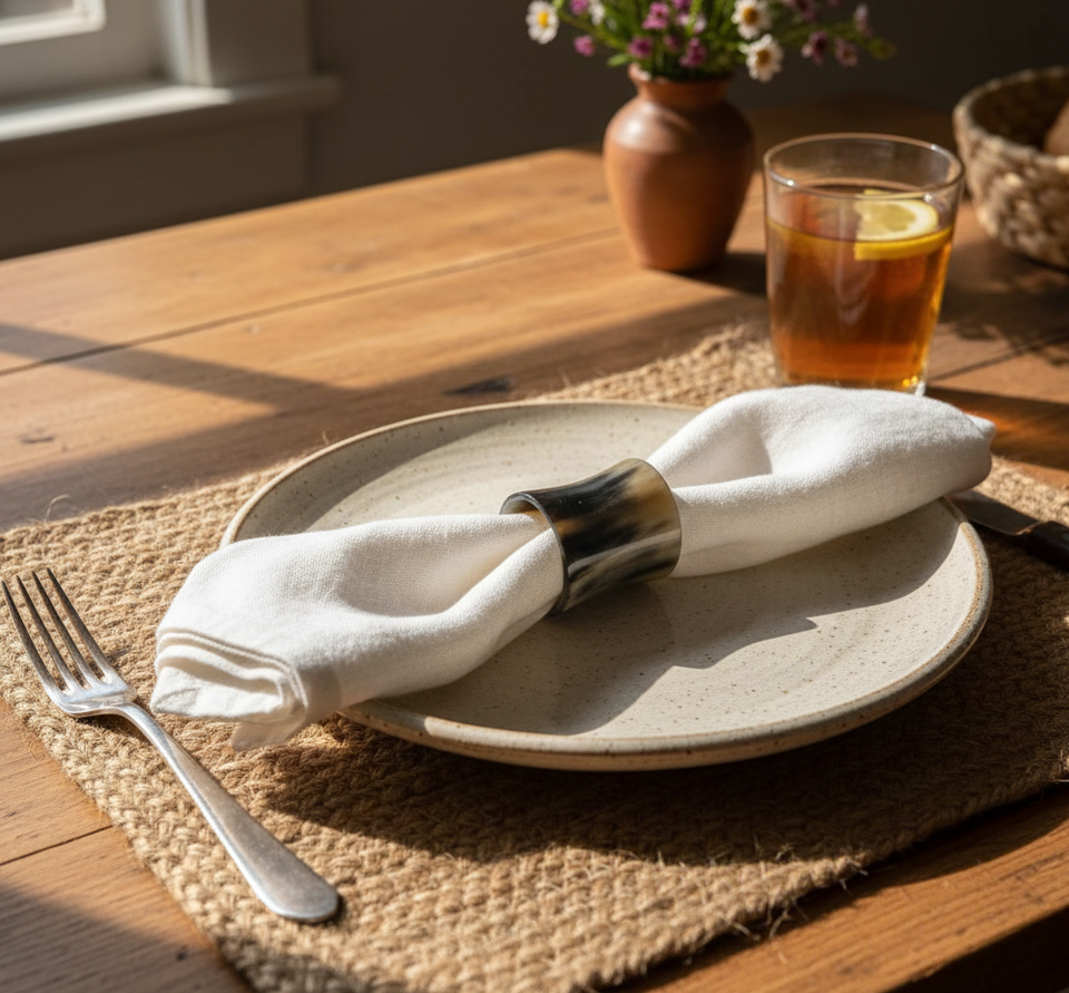 แหวนรองจานทำจากเขาควายธรรมชาติ | อุปกรณ์ตกแต่งโต๊ะทำมือ | ลวดลายธรรมชาติที่เป็นเอกลักษณ์และรูปทรงของของตกแต่งโต๊ะ