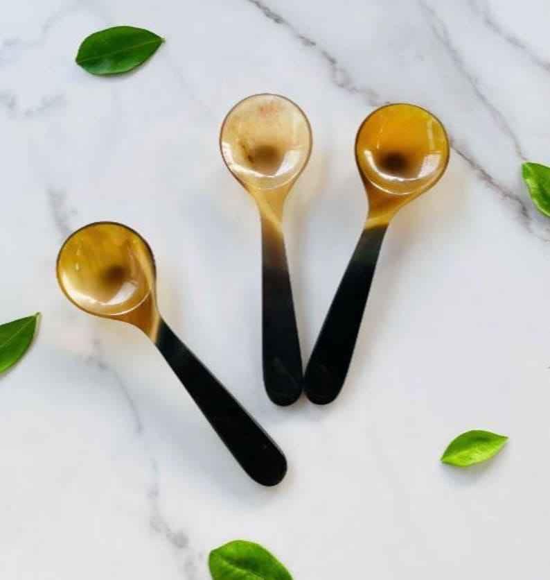 ช้อนเขาควายธรรมชาติ ทำด้วยมือและขัดเงา เหมาะสำหรับเสิร์ฟเครื่องเทศ น้ำจิ้ม หรือใช้ตกแต่งโต๊ะอาหาร คุณภาพสูง