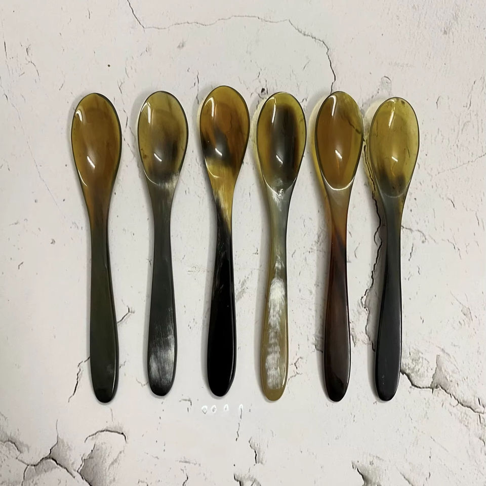 ช้อนเขาควายธรรมชาติ ทำด้วยมือและขัดเงา เหมาะสำหรับเสิร์ฟเครื่องเทศ น้ำจิ้ม หรือใช้ตกแต่งโต๊ะอาหาร คุณภาพสูง