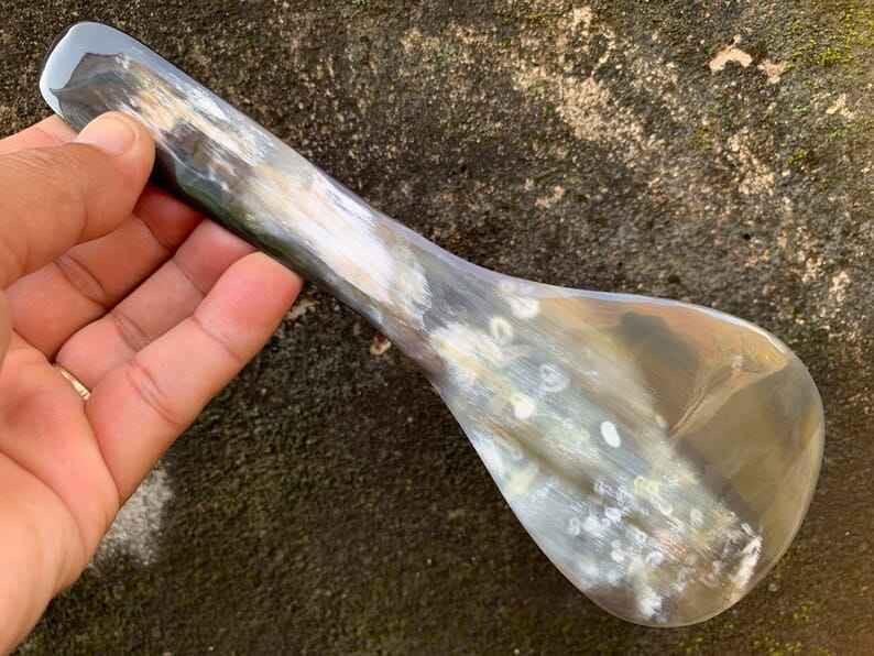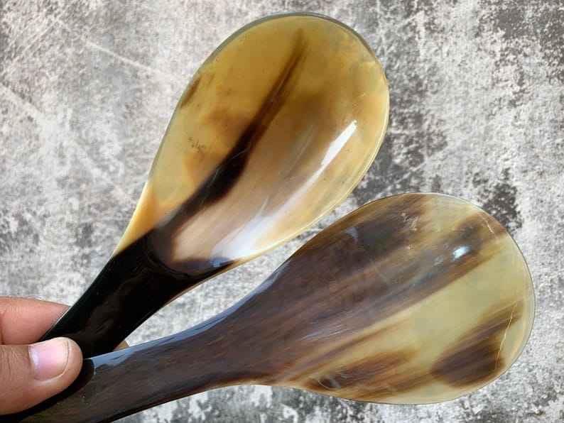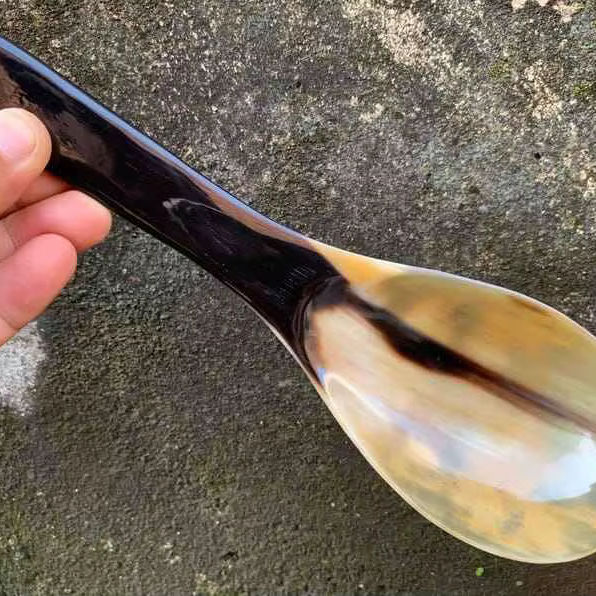 ช้อนเขาควายธรรมชาติ ทำด้วยมือและขัดเงา เหมาะสำหรับเสิร์ฟเครื่องเทศ น้ำจิ้ม หรือใช้ตกแต่งโต๊ะอาหาร คุณภาพสูง