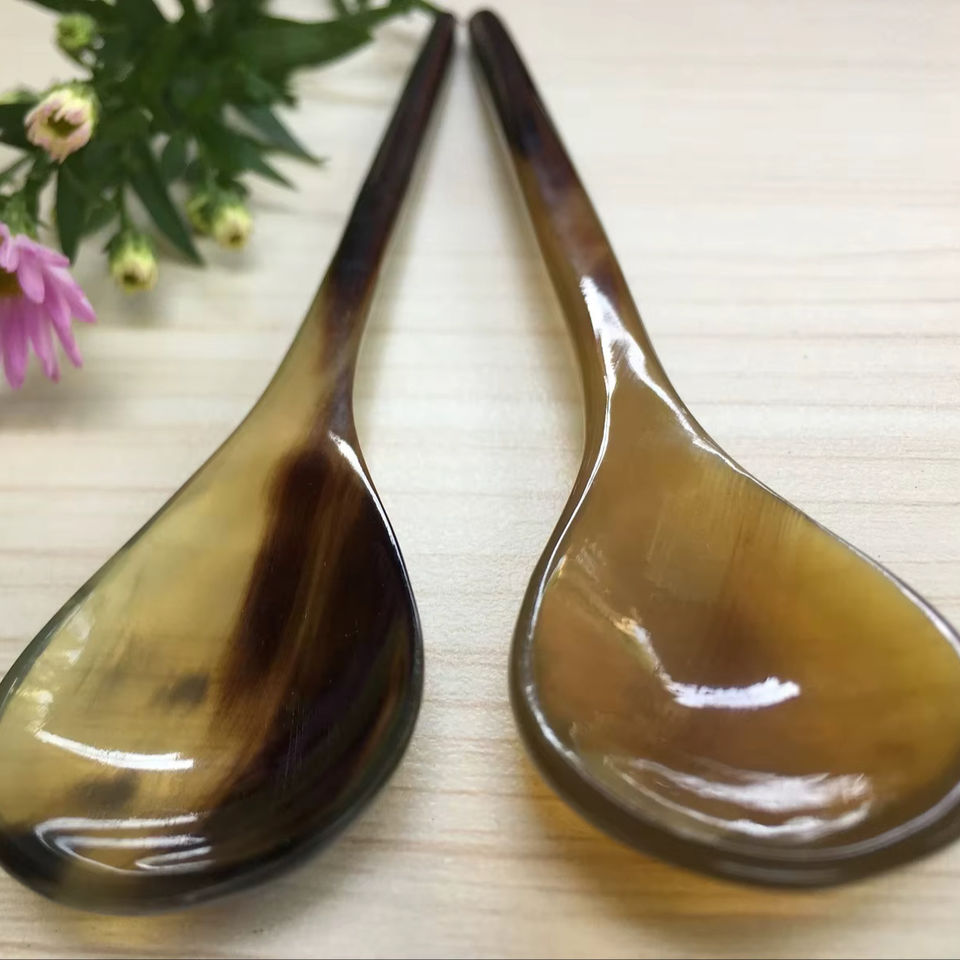 ช้อนเขาควายธรรมชาติ ทำด้วยมือและขัดเงา เหมาะสำหรับเสิร์ฟเครื่องเทศ น้ำจิ้ม หรือใช้ตกแต่งโต๊ะอาหาร คุณภาพสูง